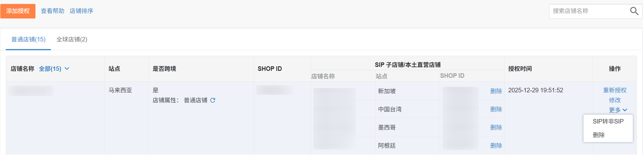 授权成功,小秘页面显示如图(可查看是否跨境、Shop ID、SIP店铺情况、自定义修改店铺名称,方便在小秘系统区分管理):