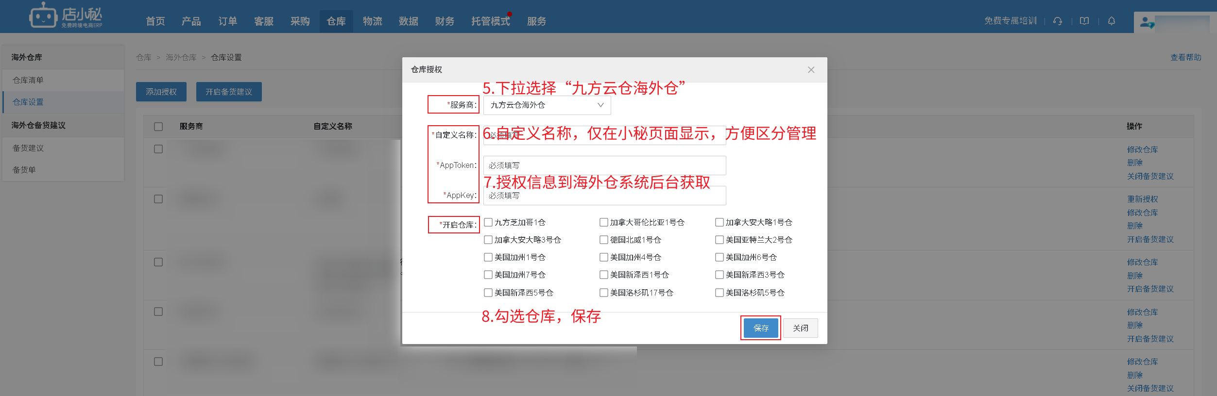 【仓库—海外仓库—仓库设置—添加授权—选择“九方云仓海外仓”—自定义名称—登录海外仓系统后台获取—勾选仓库—保存即可】