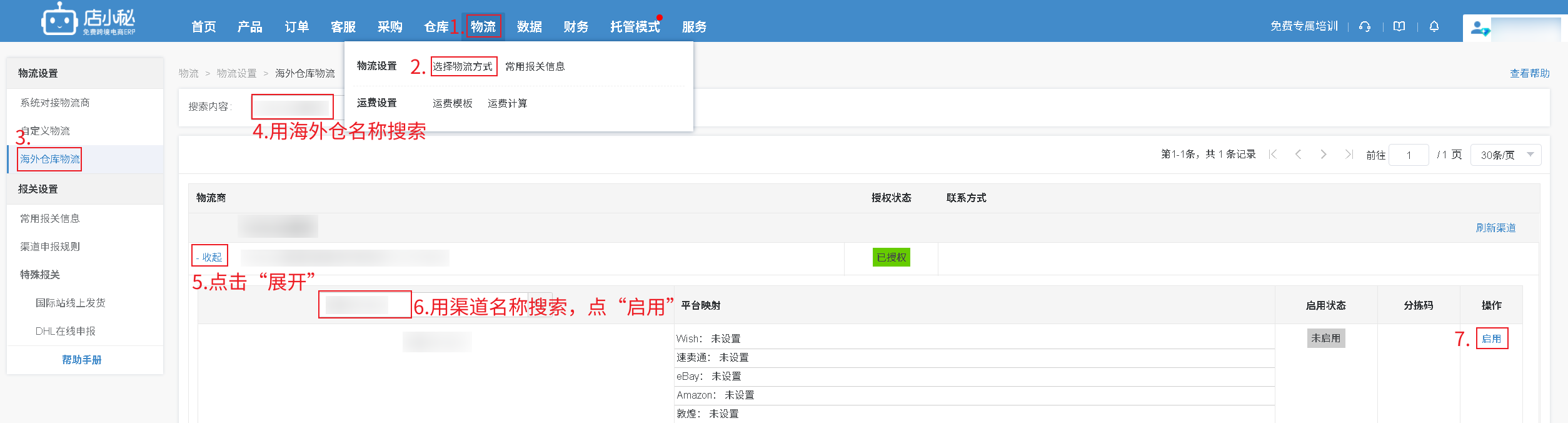 【物流—选择物流方式—海外仓仓库物流—找到对应启用的仓库—点击展开—启用—完善物流设置—保存】