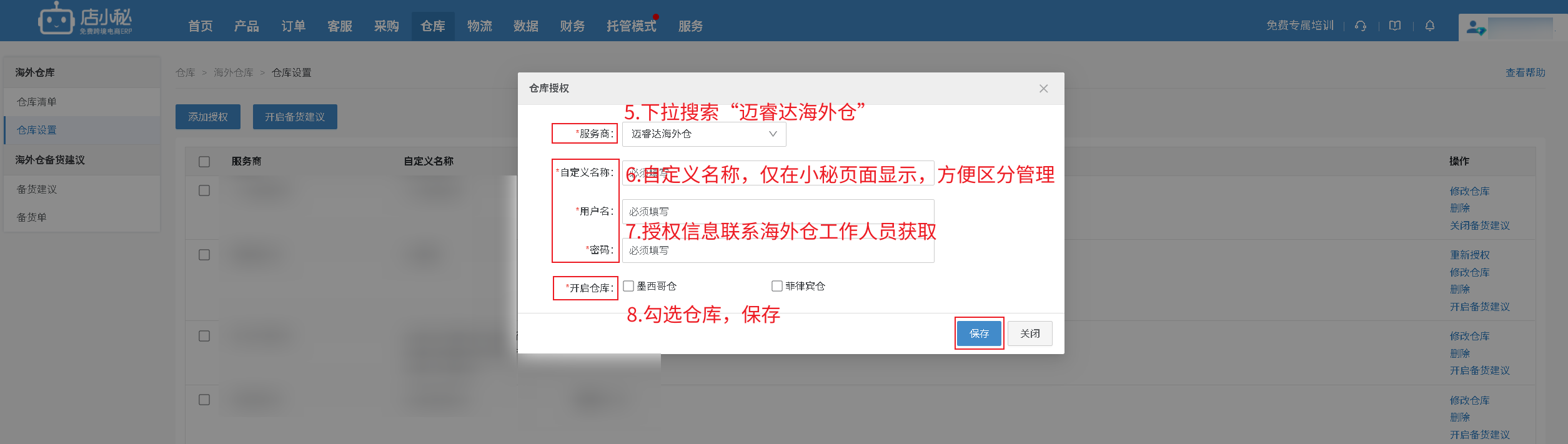 【仓库—海外仓库—仓库设置—添加授权—选择“迈睿达海外仓”—自定义名称—联系海外仓工作人员获取—勾选仓库—保存即可】