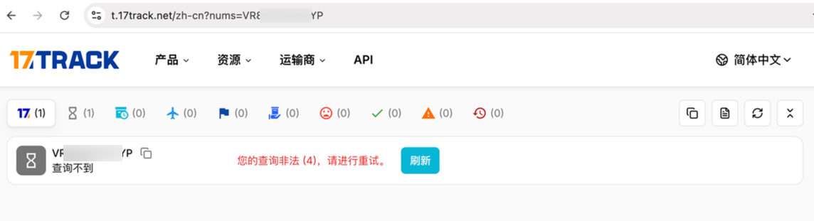 Q10:17track查询运单号轨迹报错:您的查询非法,轻进行重试