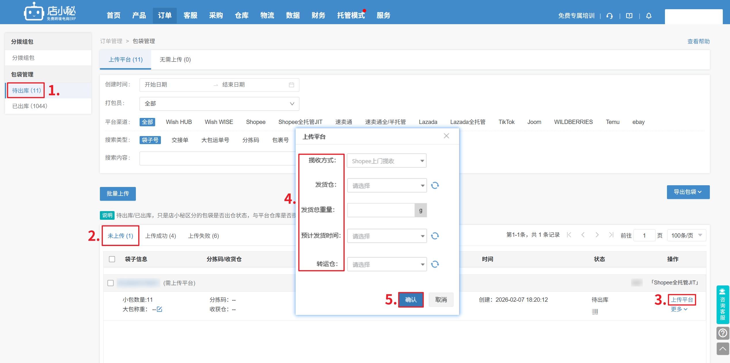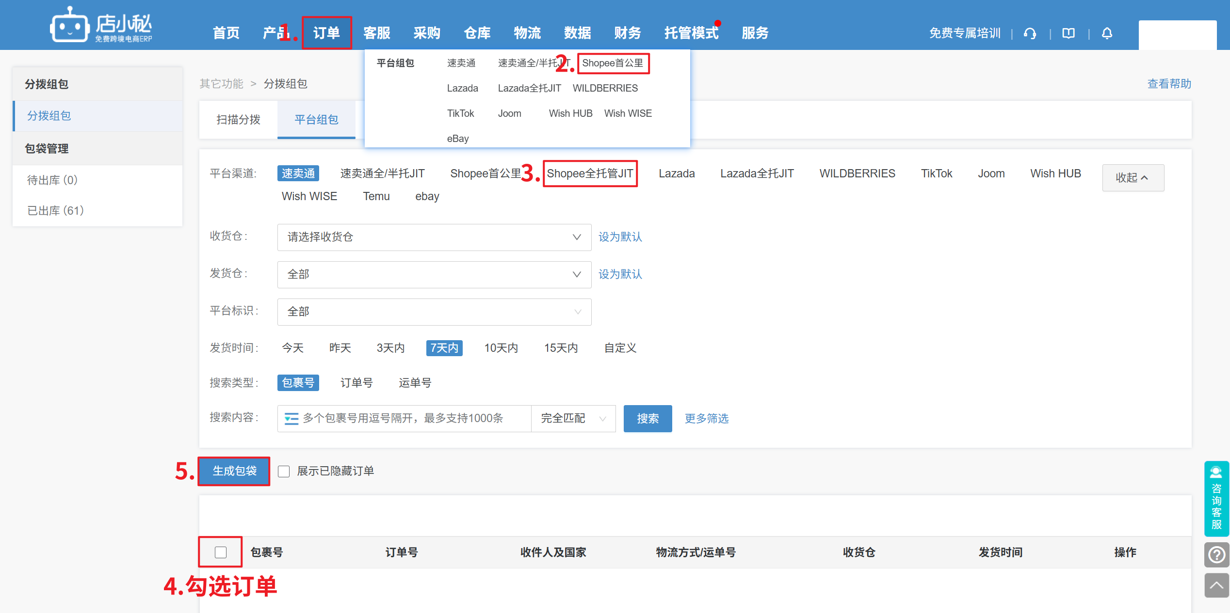4、【订单—平台组包—选择Shopee全托管JIT—勾选订单—生成包袋,移入包袋管理】