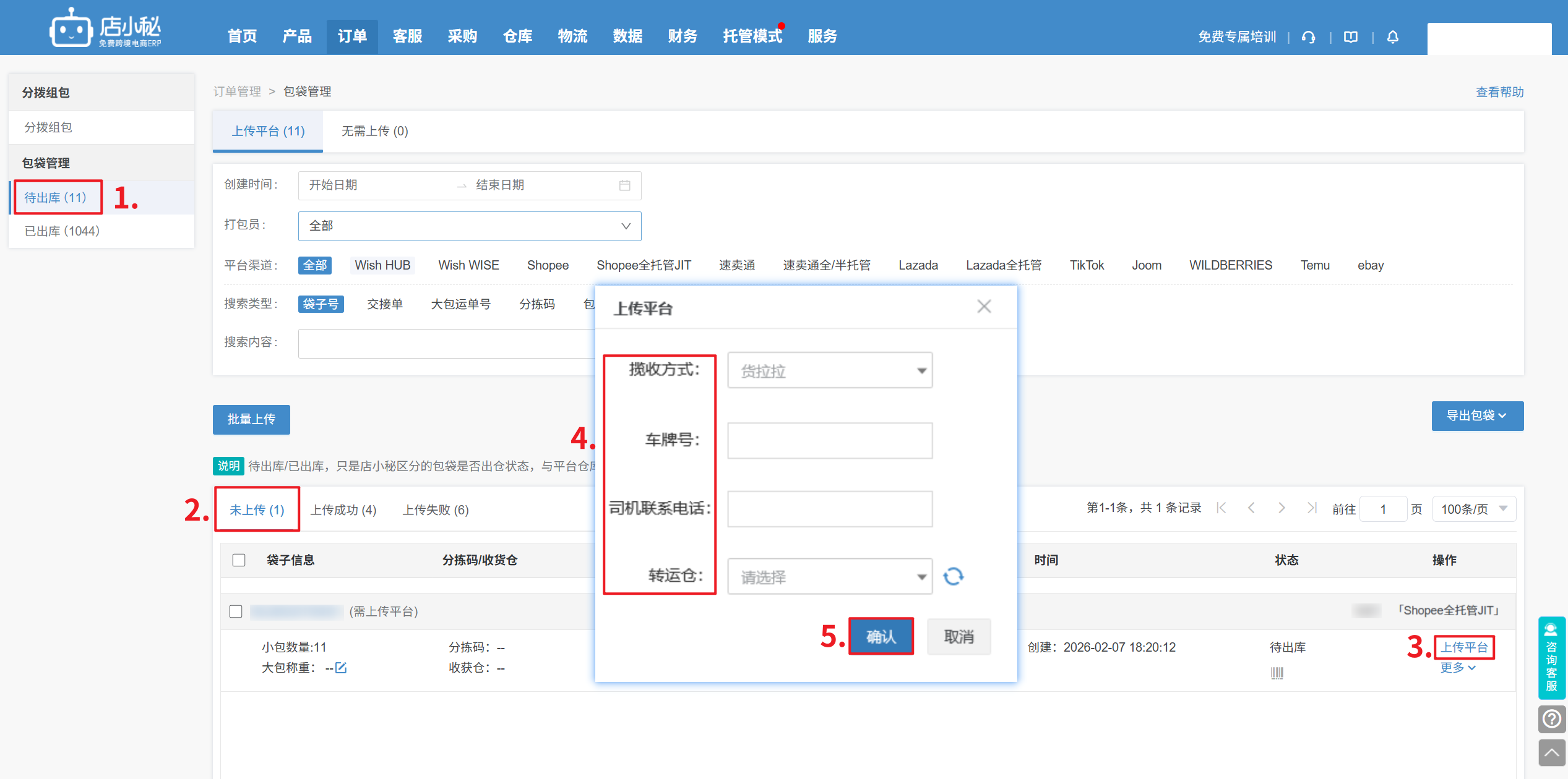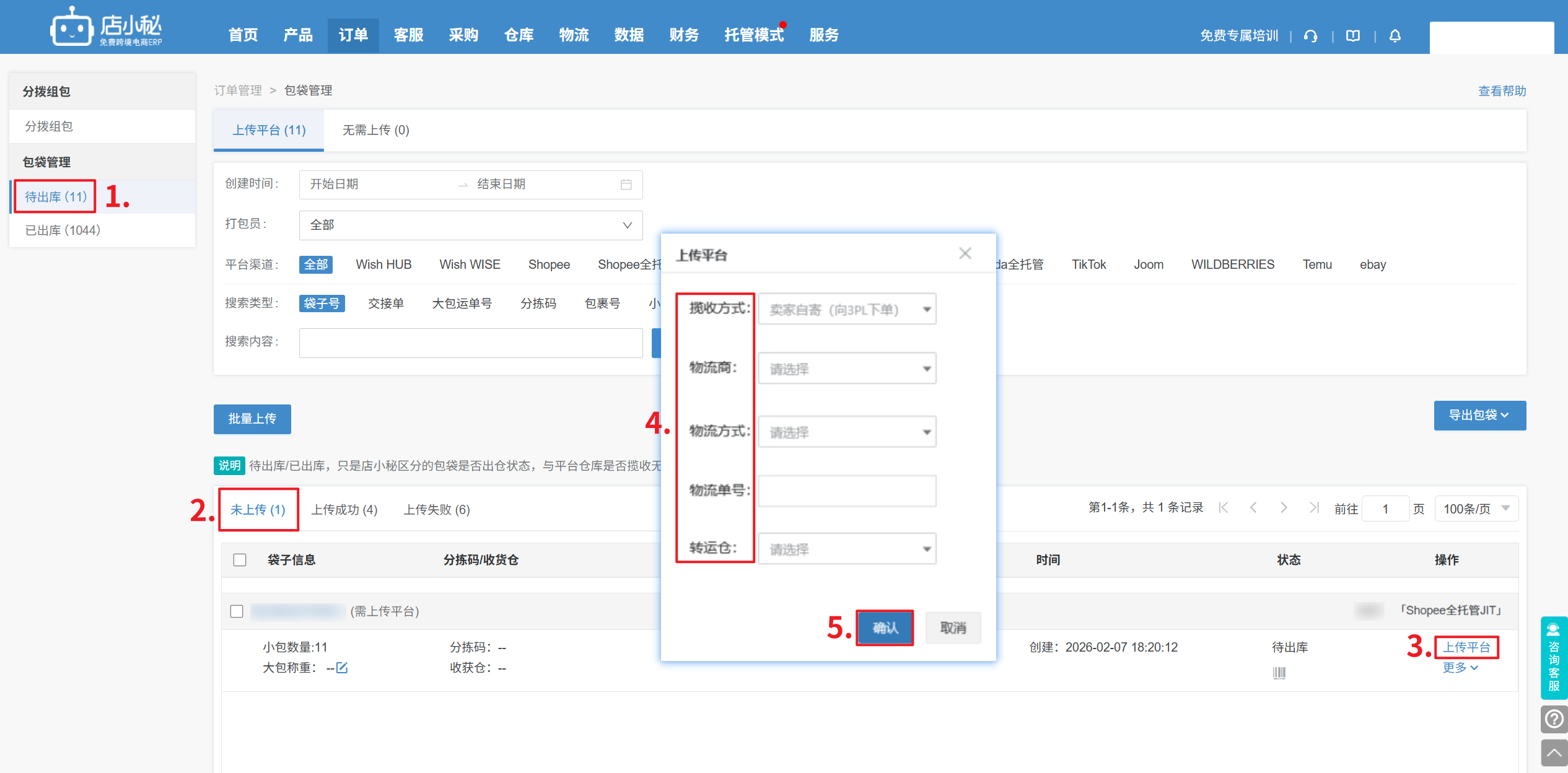 5、【包袋管理—待出库—批量上传/单个上传平台—选择揽收方式】
