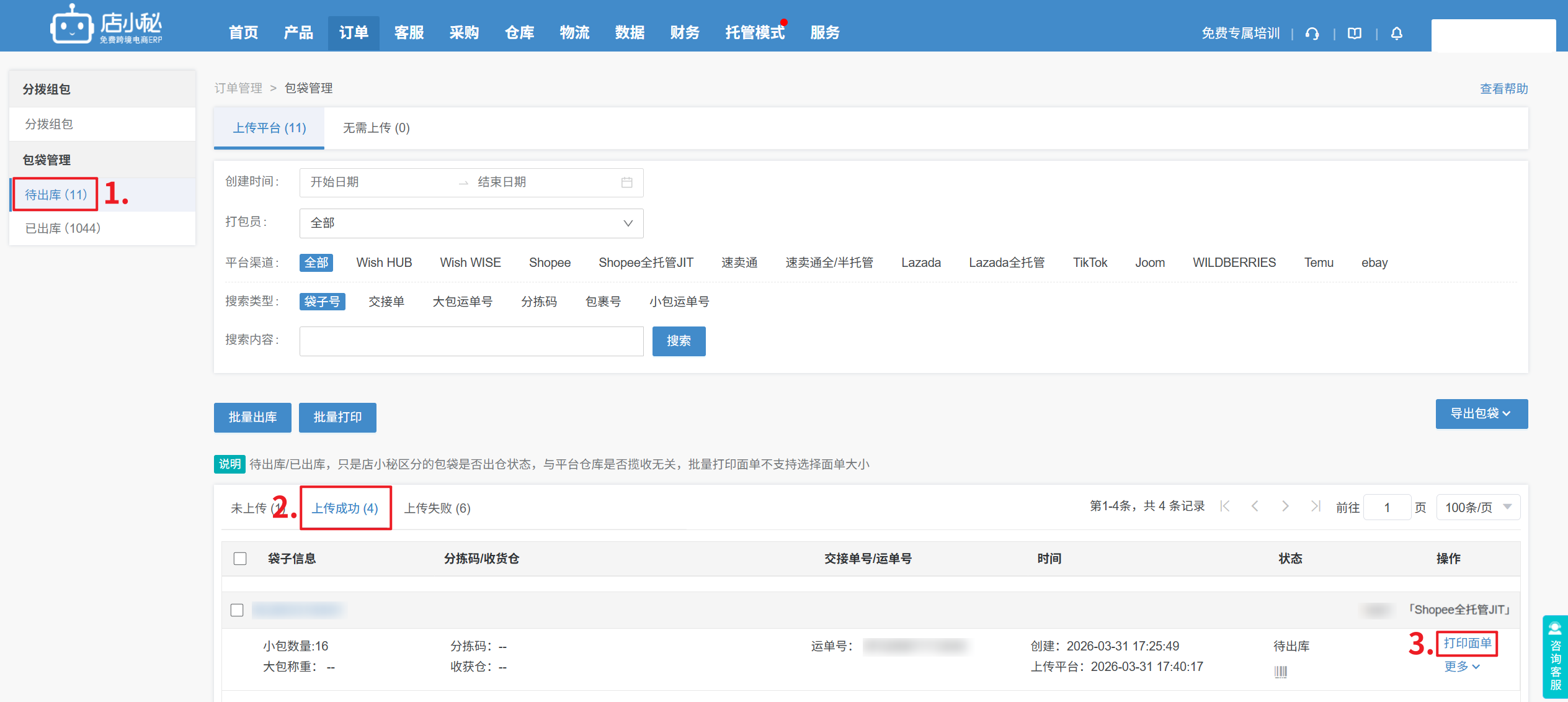 第三步:授权店铺、物流成功后,到订单页面处理Shopee全托管JIT直发订单