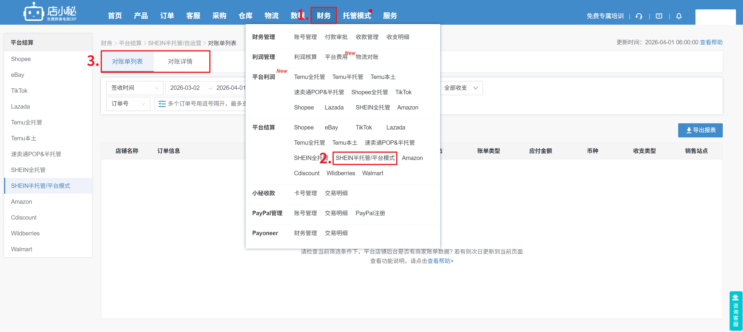 【财务—平台结算—Shein半托管/平台模式—可选择按对账单列表、对账详情—选择店铺、时间段,查看平台结算数据】