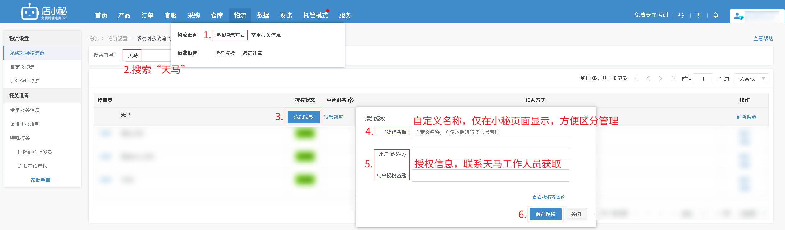 第一步:【物流—选择物流方式—搜索“天马”—添加授权—自定义物流商名称—授权信息联系天马工作人员获取—保存授权】