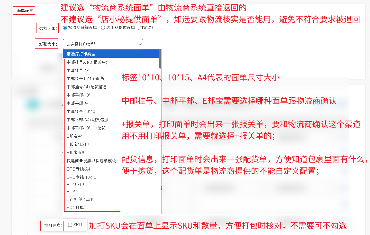 标签10*10、10*15、A4代表的面单尺寸大小,中邮挂号、中邮平邮、E邮宝需要选择哪种面单跟物流商确认;