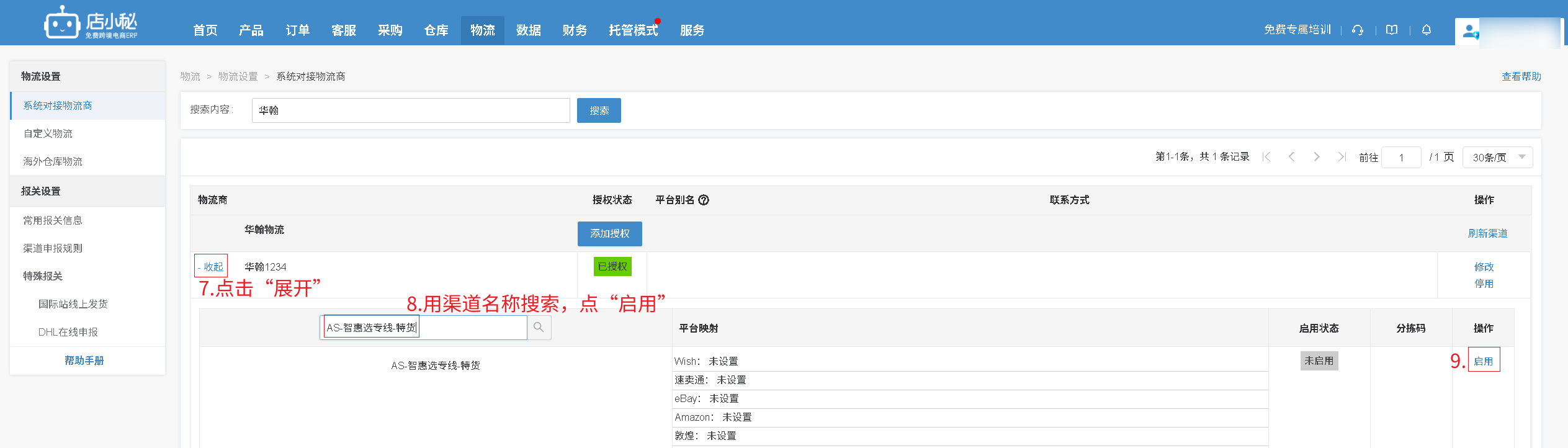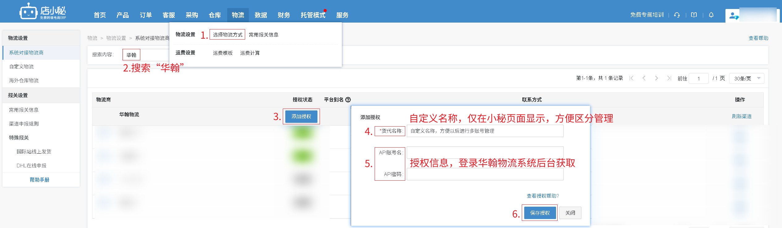 第一步:【物流—选择物流方式—搜索“华翰物流”—添加授权—自定义物流商名称—授权信息登录华翰物流系统后台获取—保存授权】