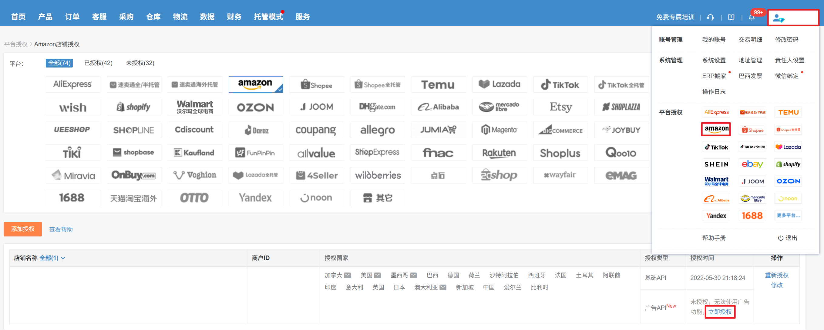 【登录小秘账号—用户名—平台授权—Amazon—广告API—立即授权—登录Amazon店铺账号密码后,完成授权】