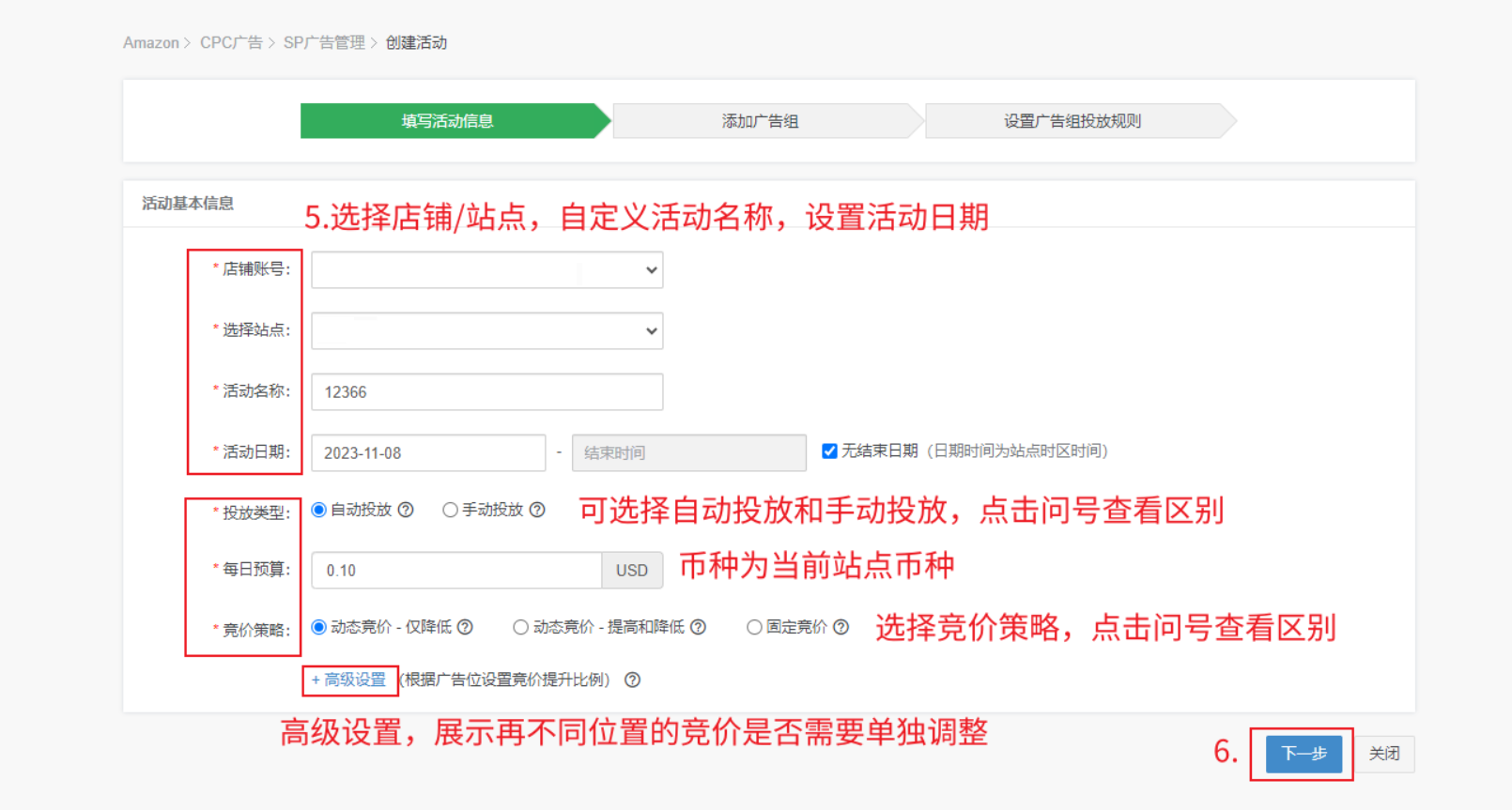 第三步:【选择店铺、站点—自定义活动名称—开始/结束时间—选择投放类型—设置每日预算—设置竞价策略—下一步】