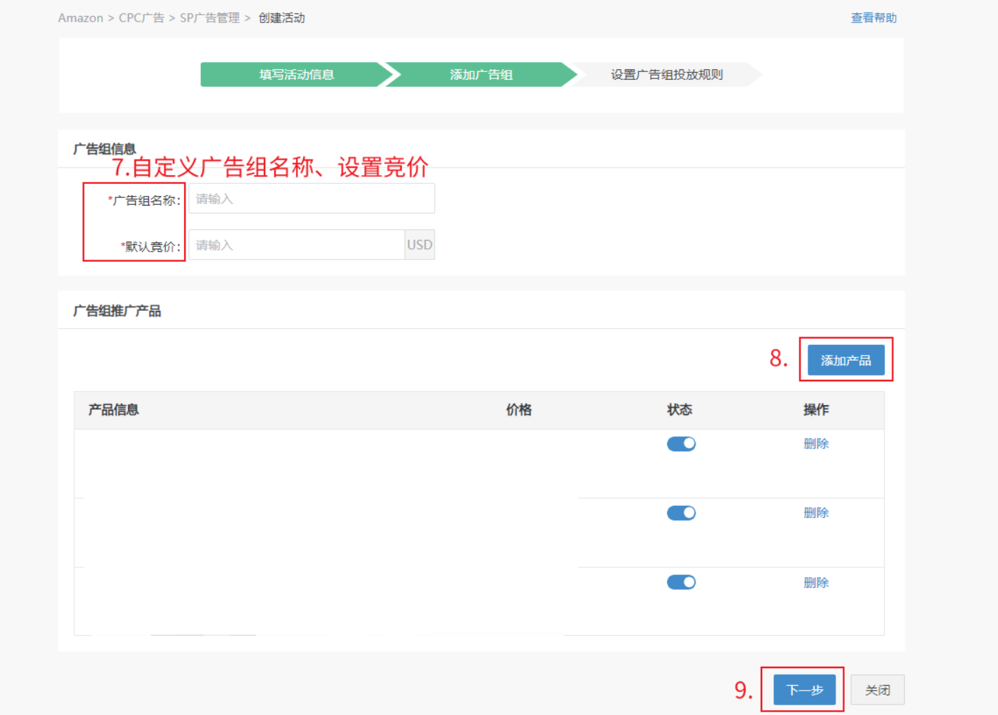 第四步:【自定义广告组名称—设置竞价—添加产品—选择具体产品—下一步—设置投放规则—选择投放类型—提交】