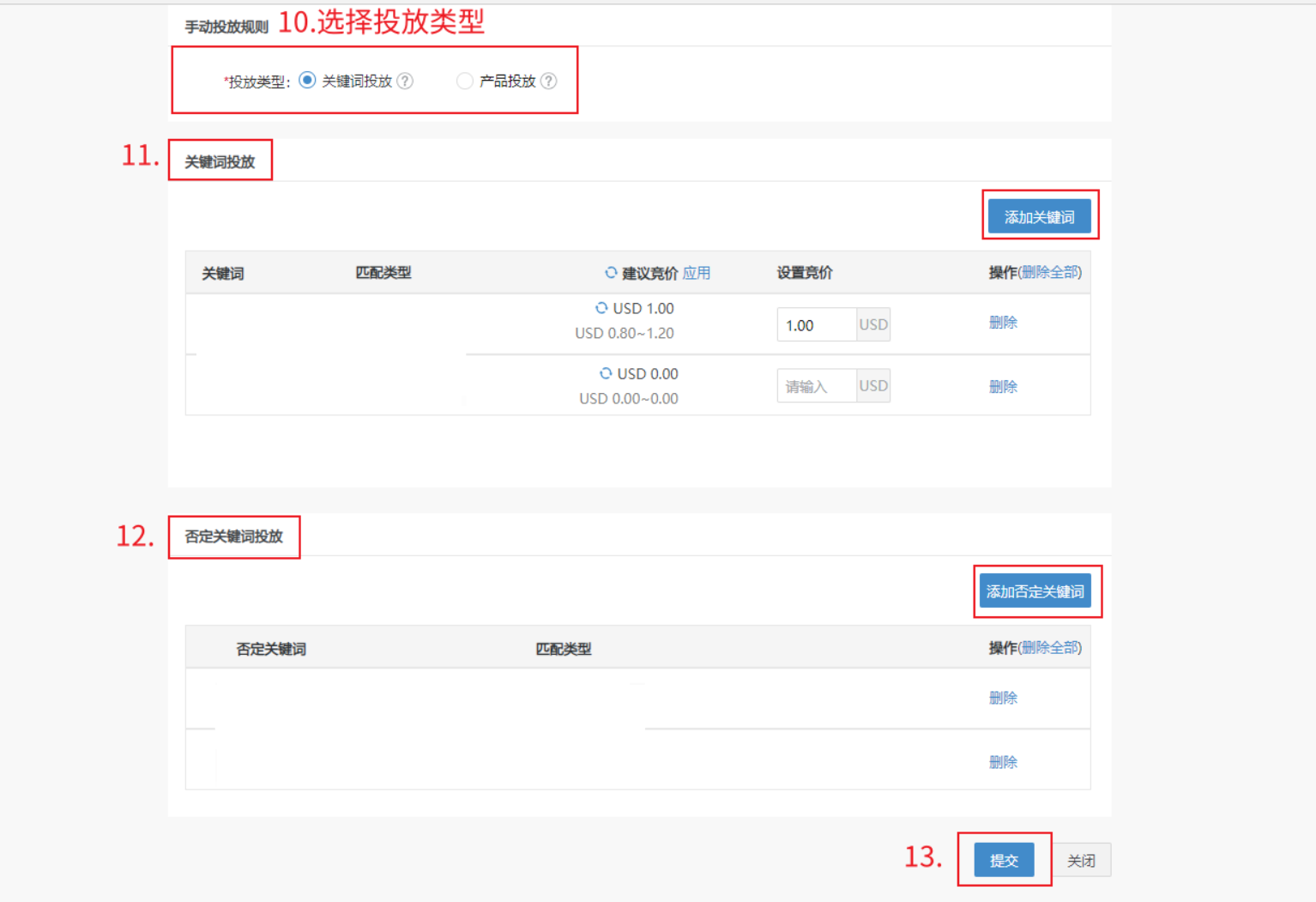 注意:投放类型选择自动投放无需添加关键词/产品,可以添加否定关键词/产品,