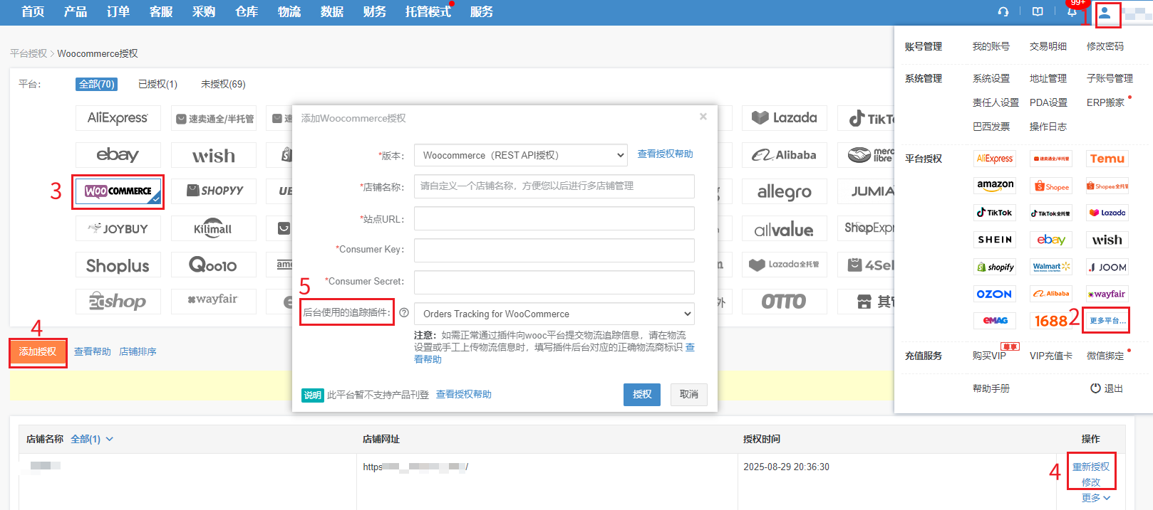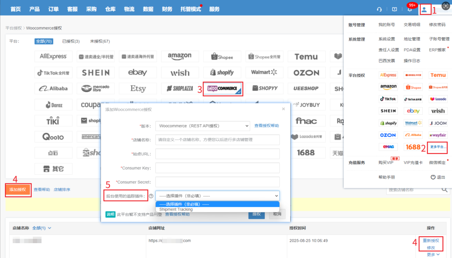 【店小秘主账号—店铺授权—WooCommerce—点击修改/重新授权/添加新店铺授权—选择插件即可】