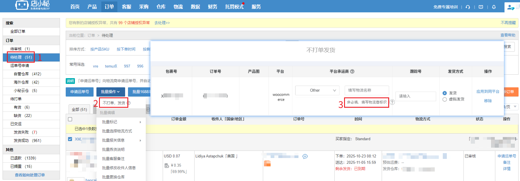 ①若是直接在订单上手动输入单号发货,在操作不打单发货时支持填写物流商标识