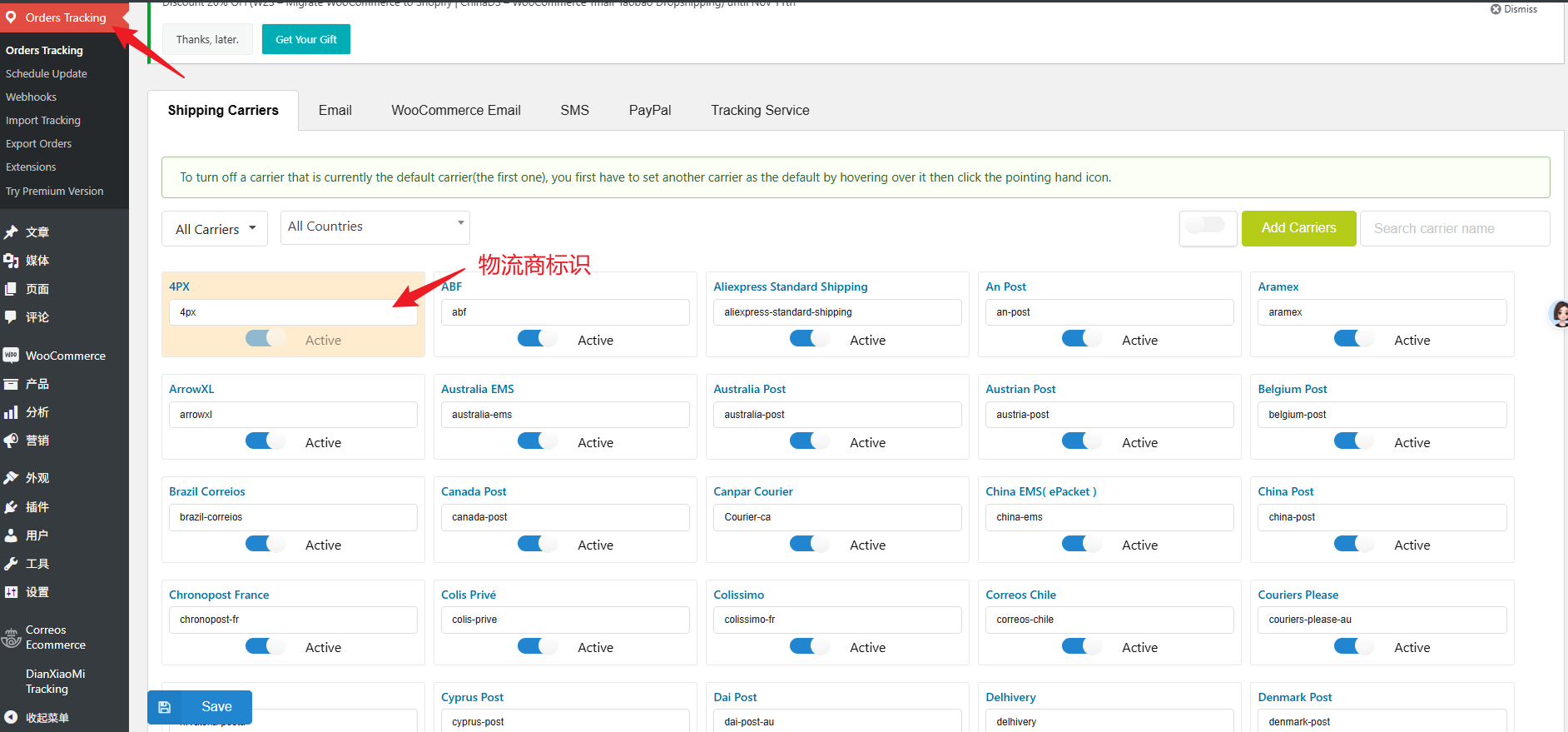 需要在物流渠道设置页面或手动上传跟踪号信息时,填写插件后台对应的正确物流商标识