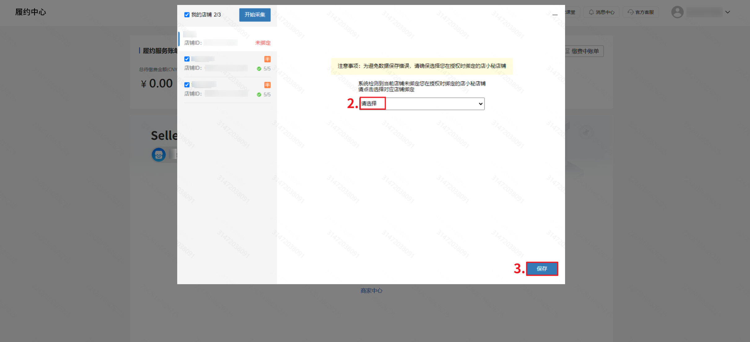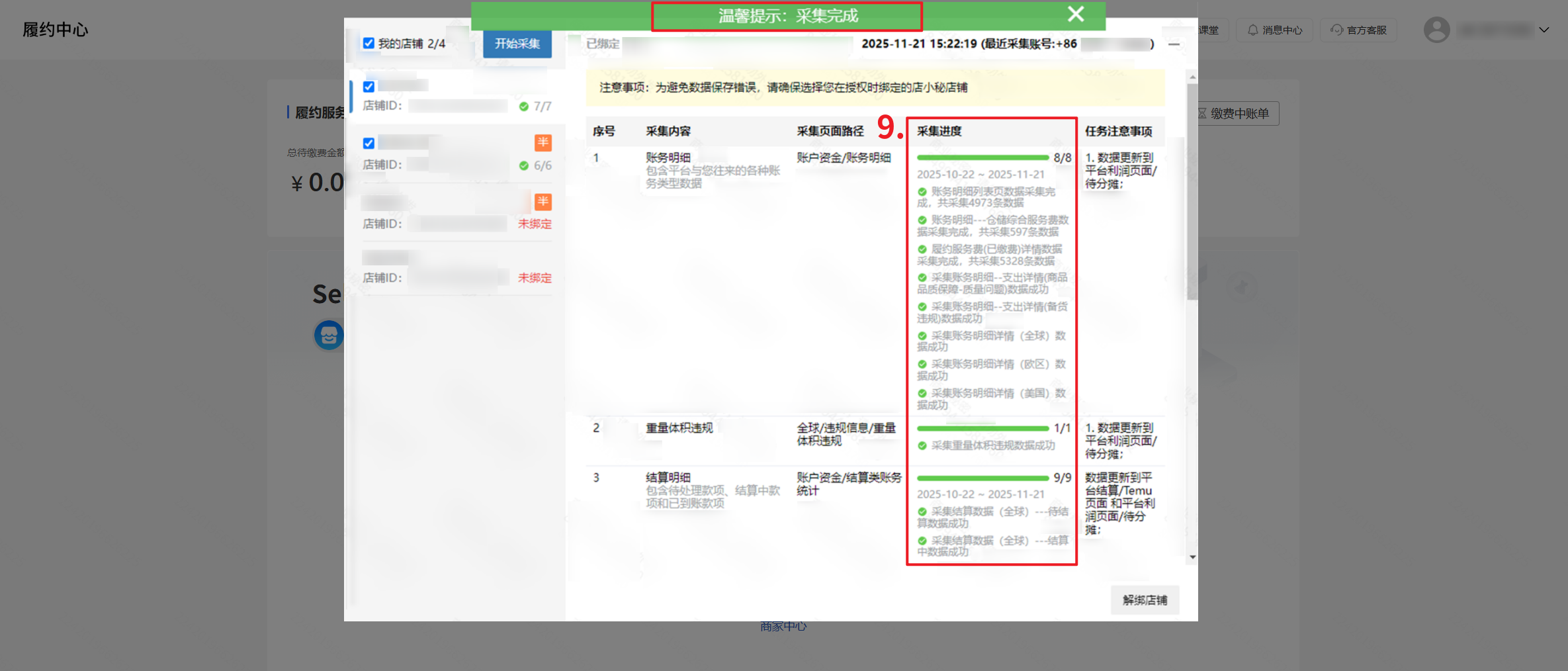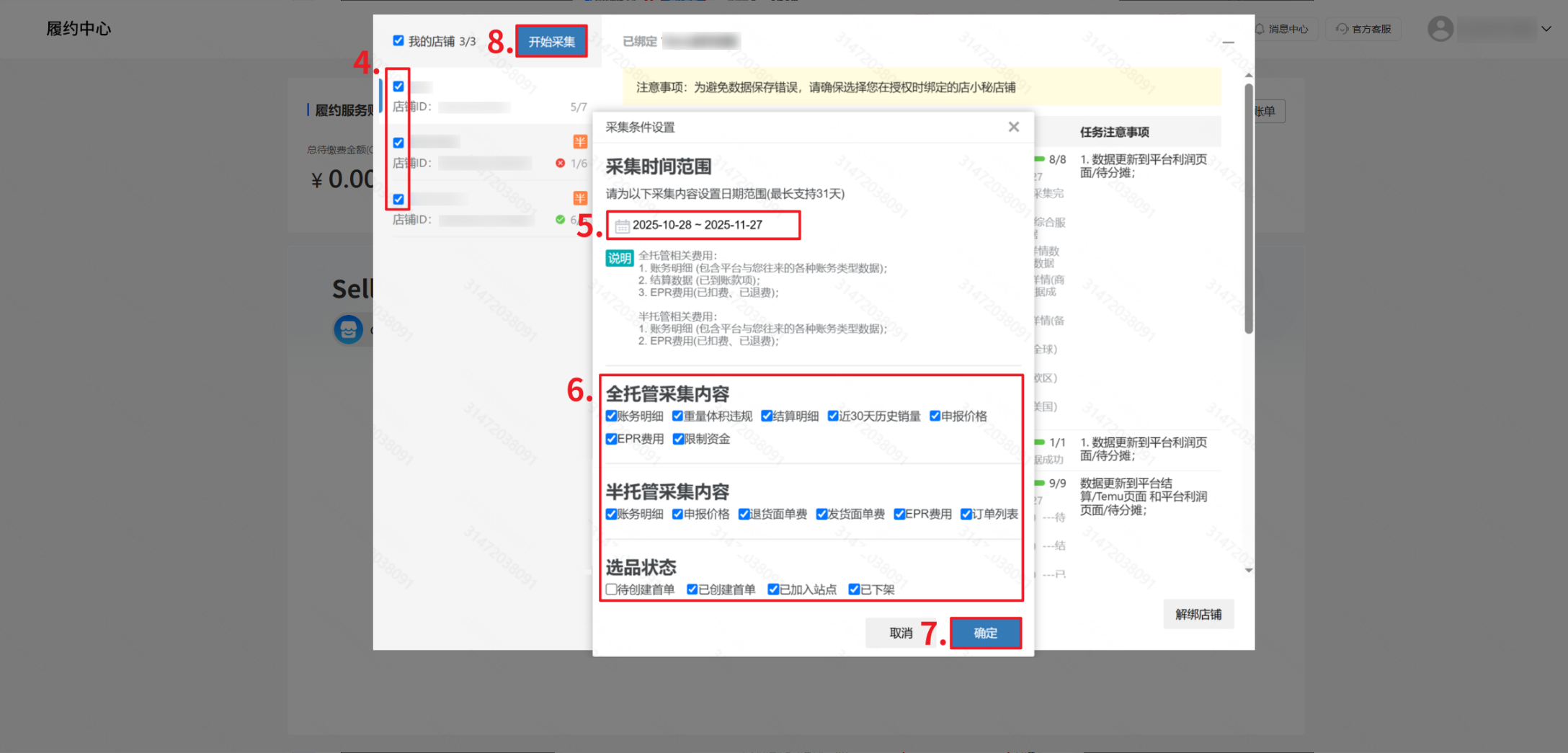 第二步:【登录店小秘主账号—进入Temu店铺后台任意页面—弹窗点击采集财务报告—绑定店铺—勾选店铺—开始采集】