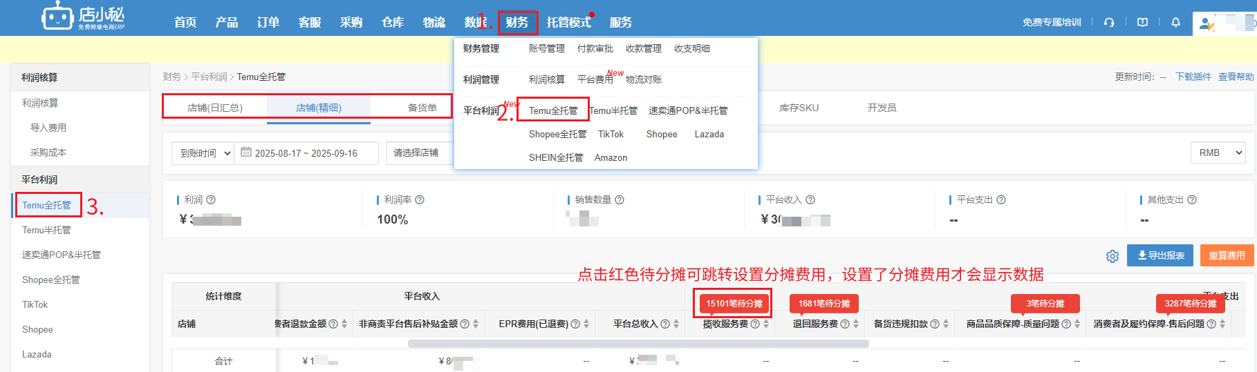 第三步:采集成功到小秘页面【财务—平台利润—Temu全托管—查看利润数据】查看