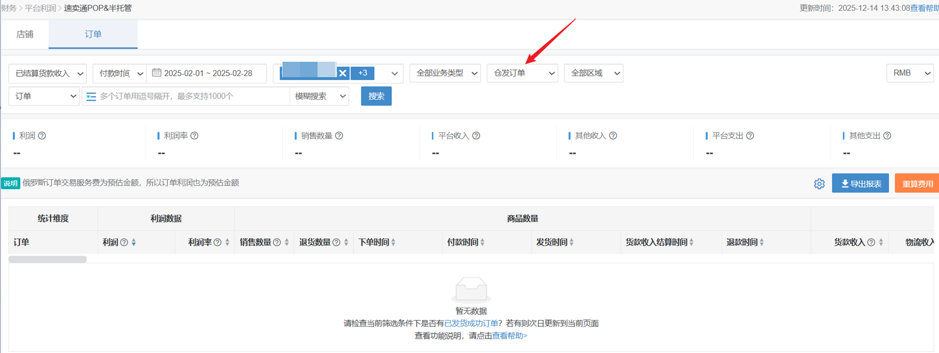 Q5:速卖通平台利润筛选付款时间2月份的订单可以正常看到订单,但为什么筛选了发货类型就看不到订单了?