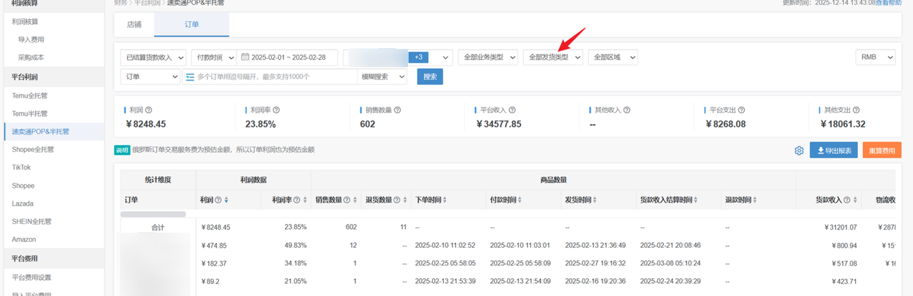 Q3:能单独筛选速卖通半托管JIT/仓发的订单利润么?
