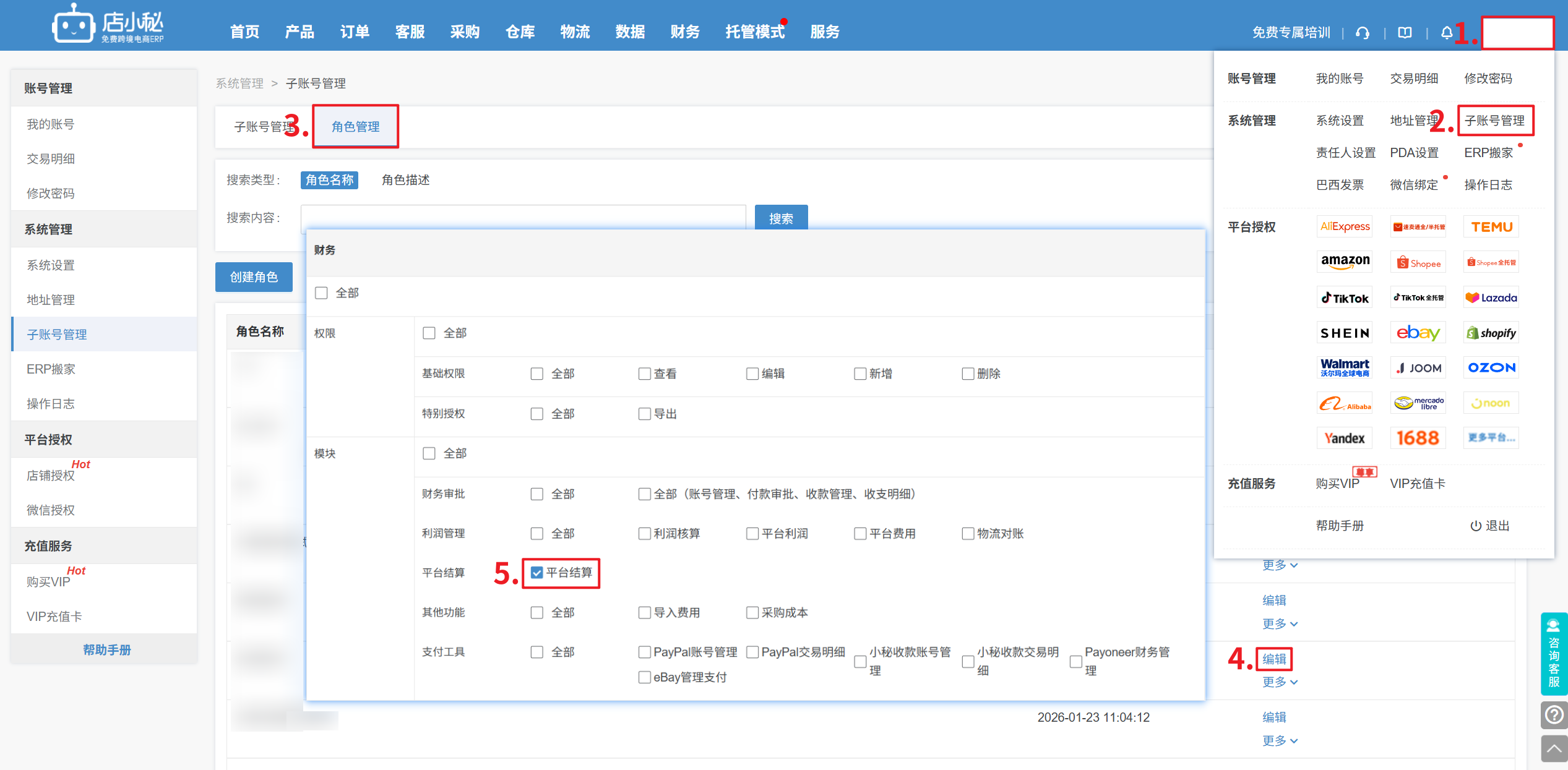 A1:【登录店小秘主账号—用户名—子账号管理—角色管理—编辑—财务模块—勾选“平台结算”】才能查看