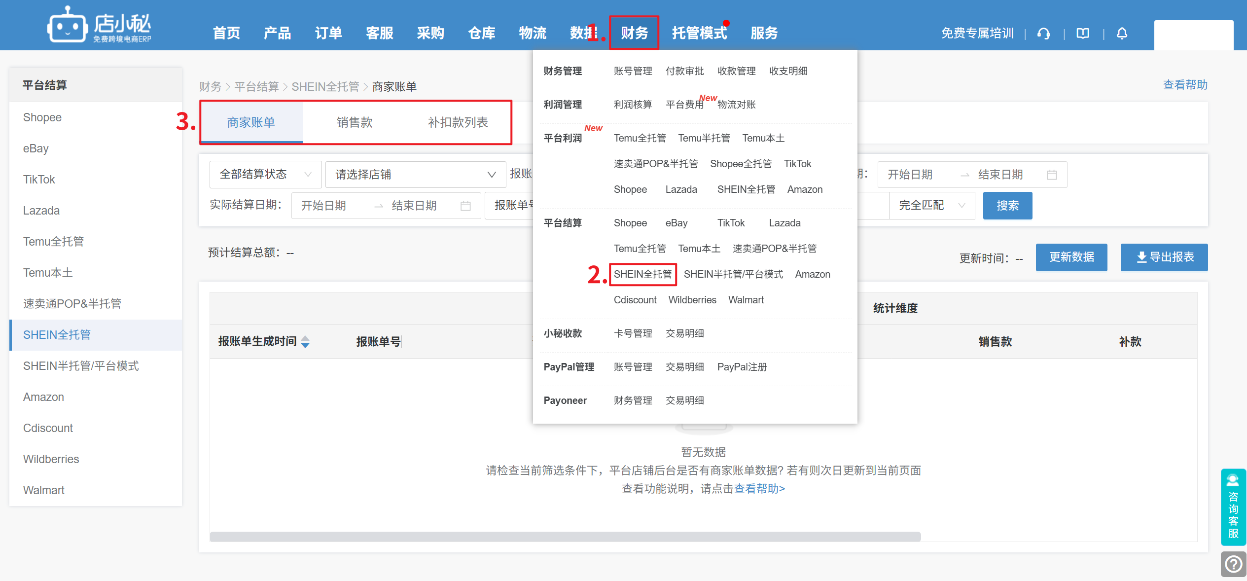 【财务—平台结算—Shein全托管—可按结算账单/销售款/补扣款列表—选择店铺、时间段,查看平台结算数据】