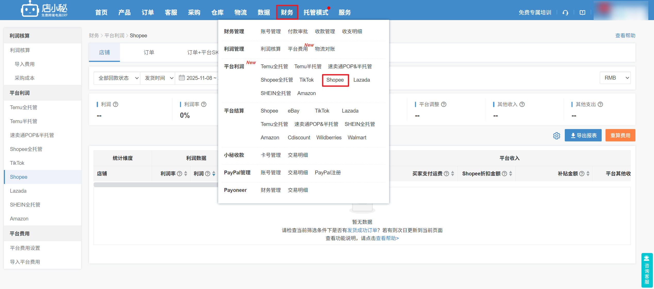 定义:通过接口获取Shopee平台结算数据,计算利润注意事项:【1】根据已发货的订单,每天自动同步数据,不需要手动采集/同步【2】SIP店铺订单Shopee平台接口不返回数据,平台利润不显示SIP店铺订单【3】2025年6月24日后支持统计Shopee仓发订单【4】2025年5月20日后已搁置订单支持统计【5】支持统计FBS以及本土订单操作步骤:【财务—平台利润—Shopee—可以选按店铺/按订单等维度查看利润数据】