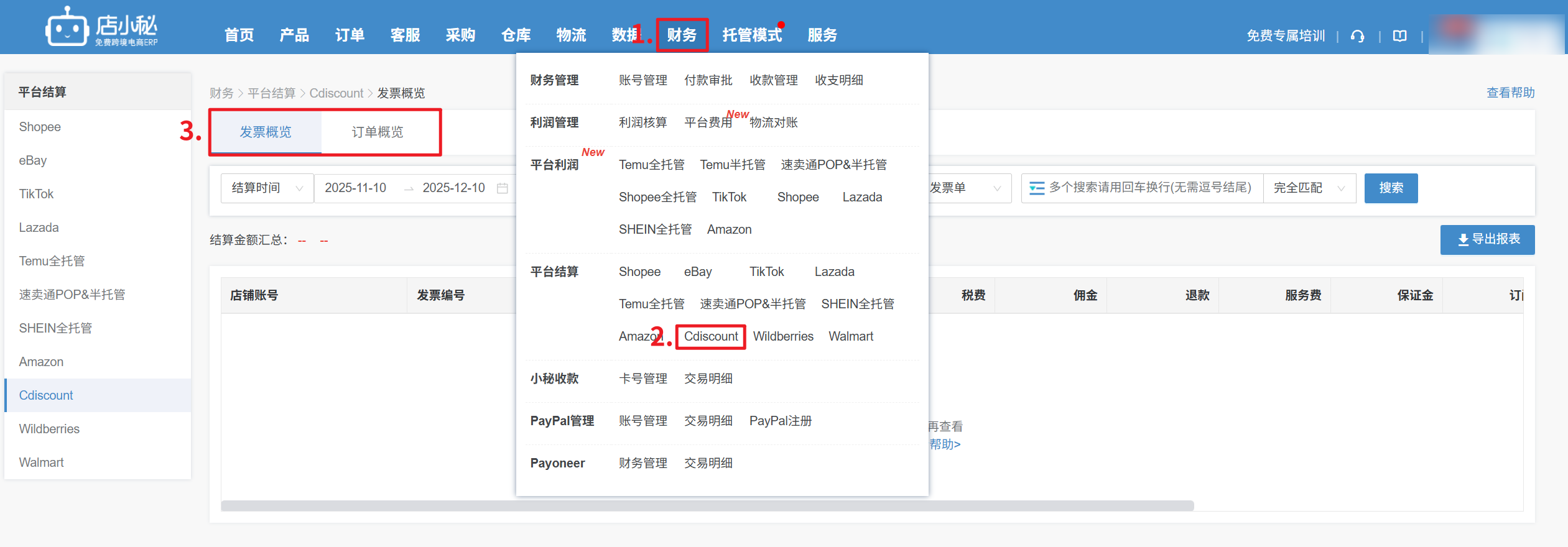 财务—平台结算—Cdiscount—可按发票概览/订单概览查看