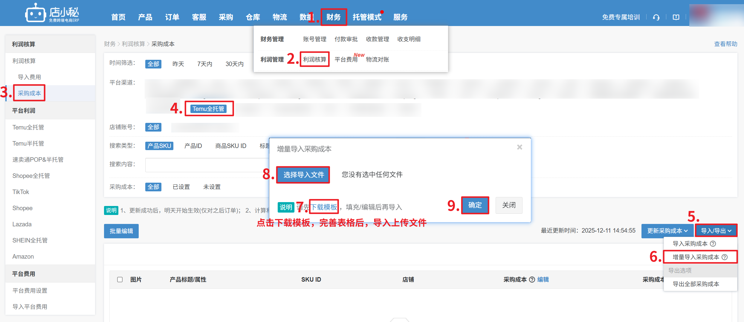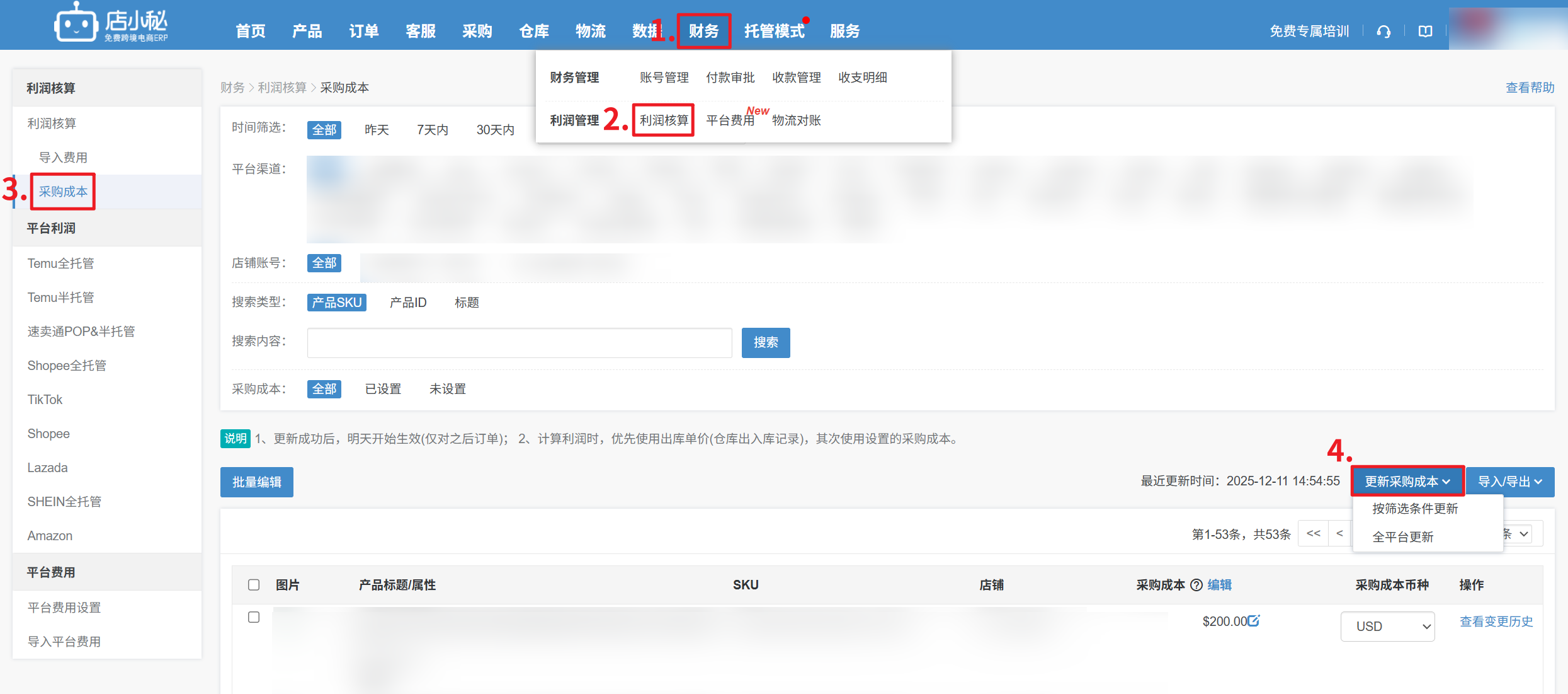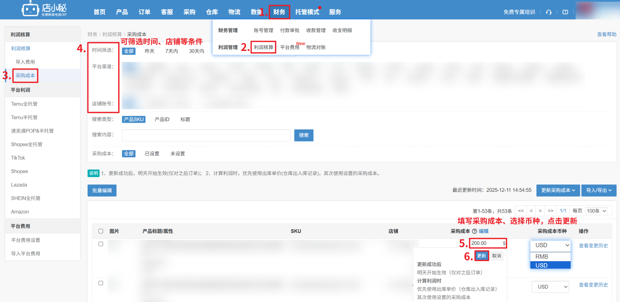 【财务—利润核算—采购成本—更新采购成本—可按页面筛选的条件(平台/店铺/勾选的SKU)或全平台更新—确定】