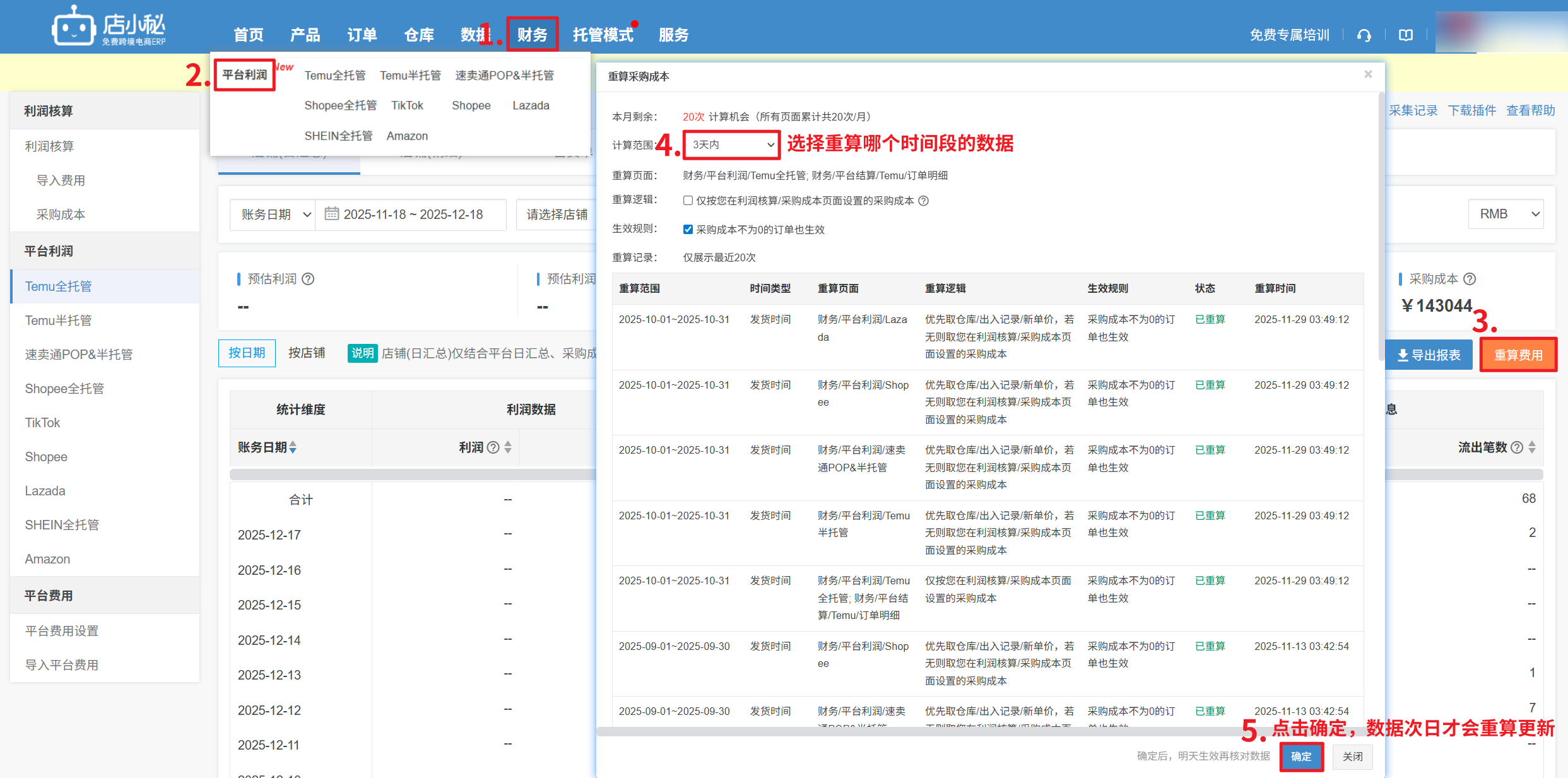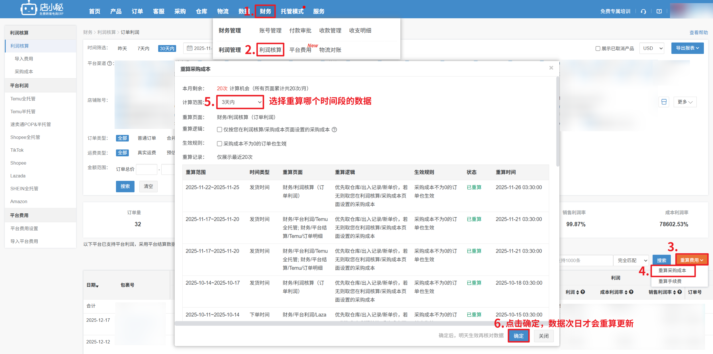 【财务—平台利润—重算费用成本—选择备货单发货时间段—确定,重算完成后,第二天查看数据】