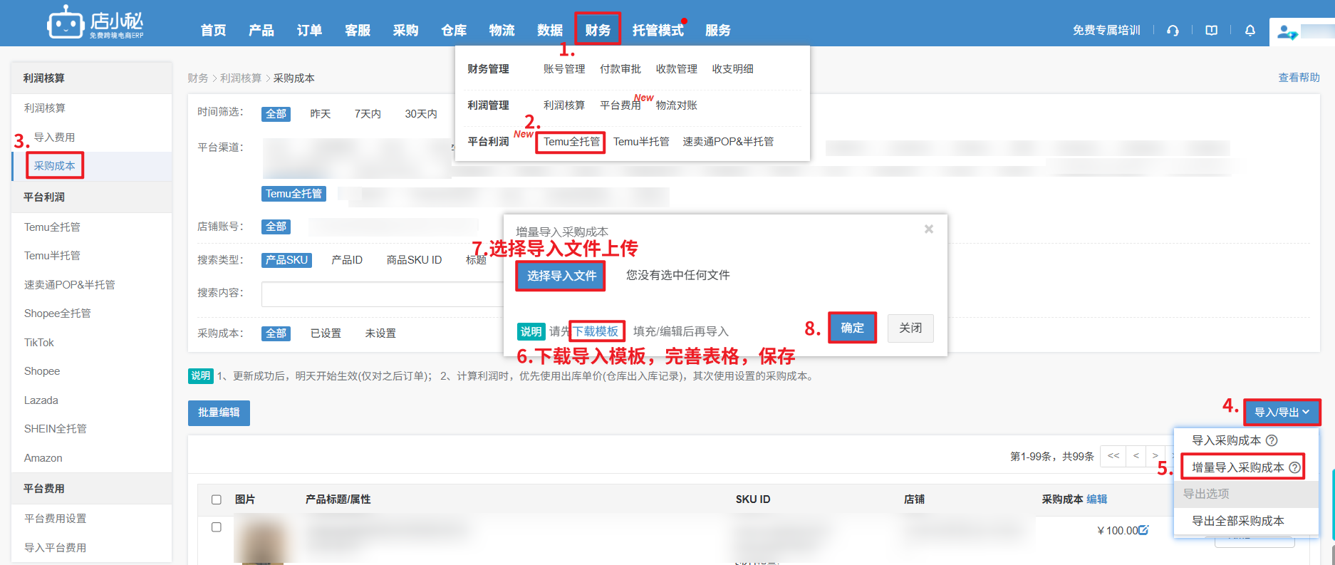 A4: 采购成本页面,若没有Temu全托管的产品SKU,可以选择【增量导入采购成本】—下载表格—填写产品信息和成本—导入即可
