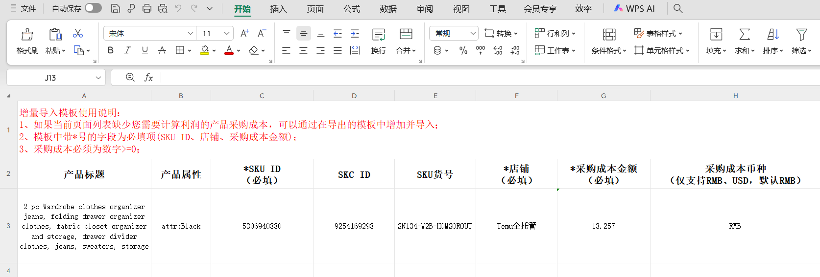 ① 适用场景: 当前采购成本页面没有产品SKU,使用表格填写好产品信息和成本再导入,仅Temu全托管店铺支持
