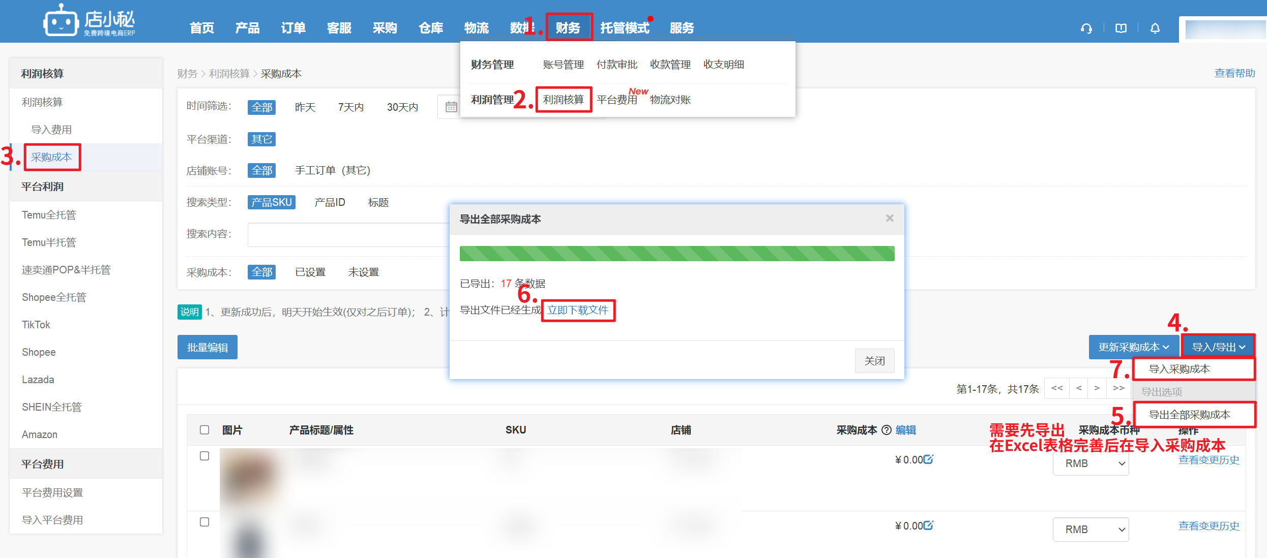 【财务—利润核算—采购成本—导出全部销量的产品SKU—在Excel表格完善采购成本后再导入】