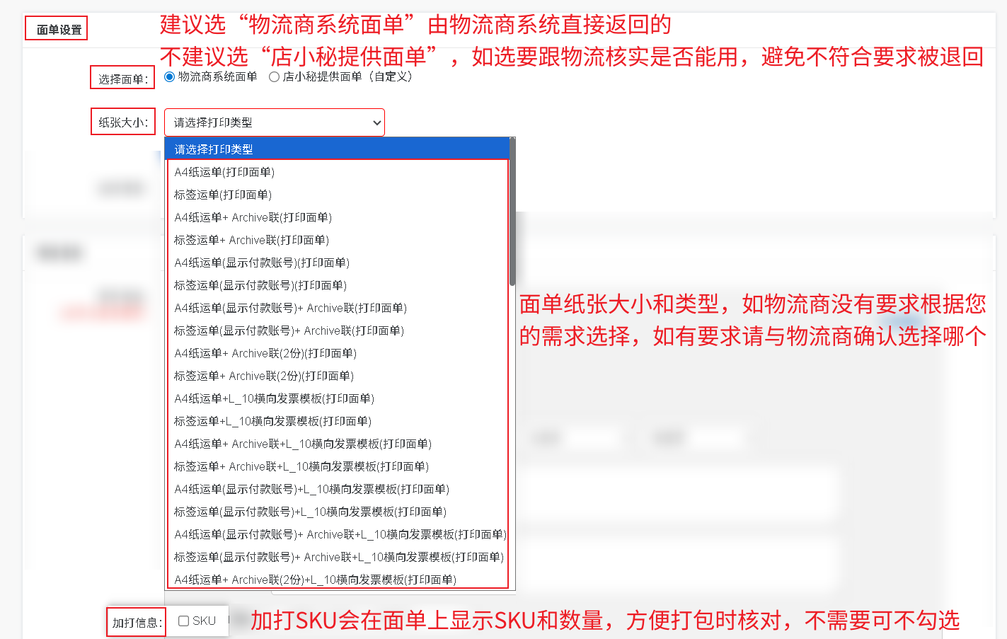 面单纸张大小和类型,如物流商没有要求根据您的需求选择,如有要求请与物流商确认选择哪个;