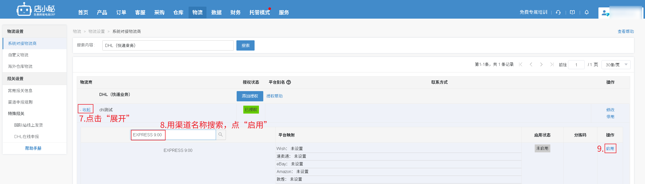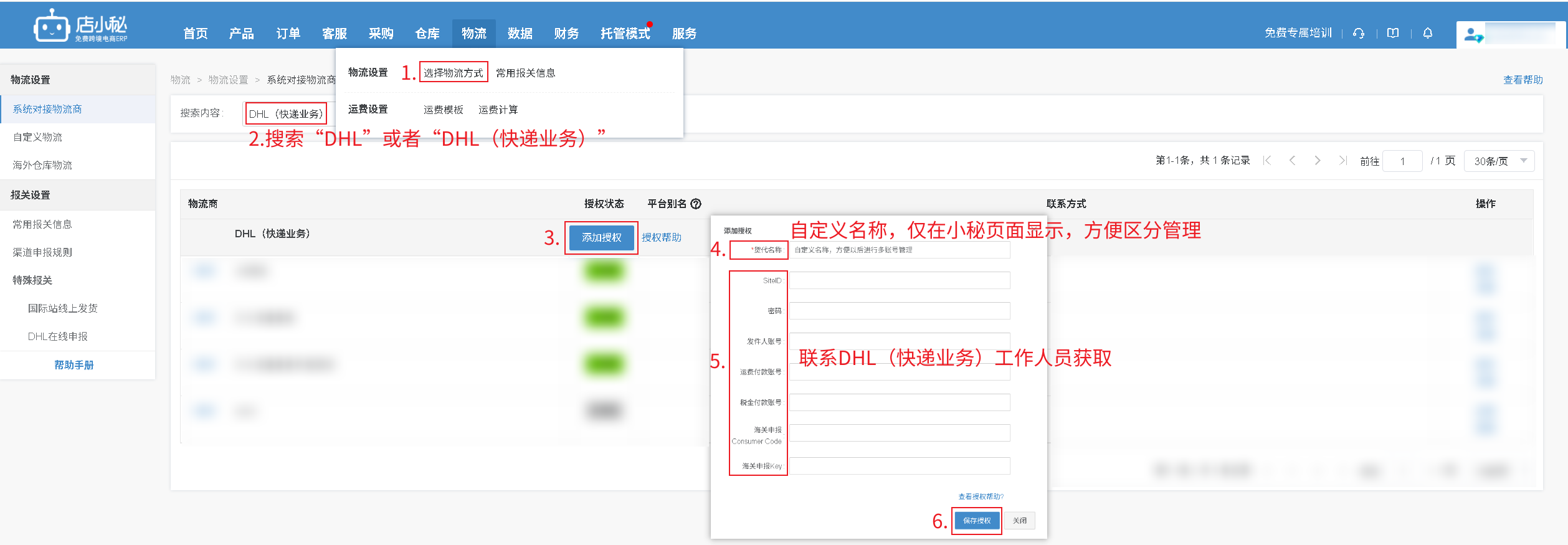 第一步:【物流—选择物流方式—搜索“DHL(快递业务)”—添加授权—自定义物流商名称—填写授权信息—保存授权】