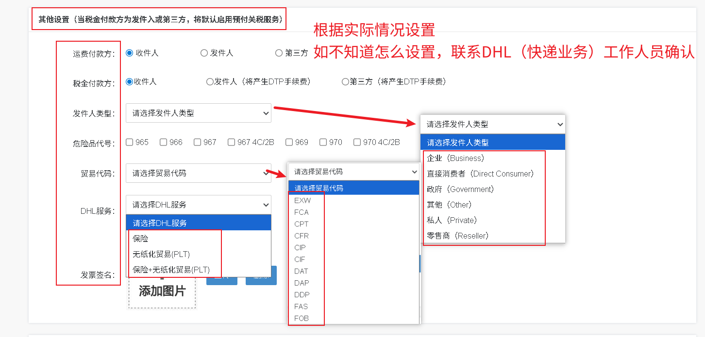根据实际情况设置,如不知道怎么设置,请联系DHL(快递业务)工作人员确认。