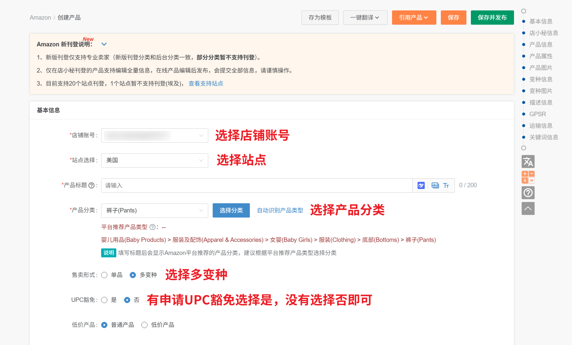 第一步:【产品—采集箱/待发布/在线产品/创建产品,选择店铺、站点、分类—选择售卖形式为多变种】