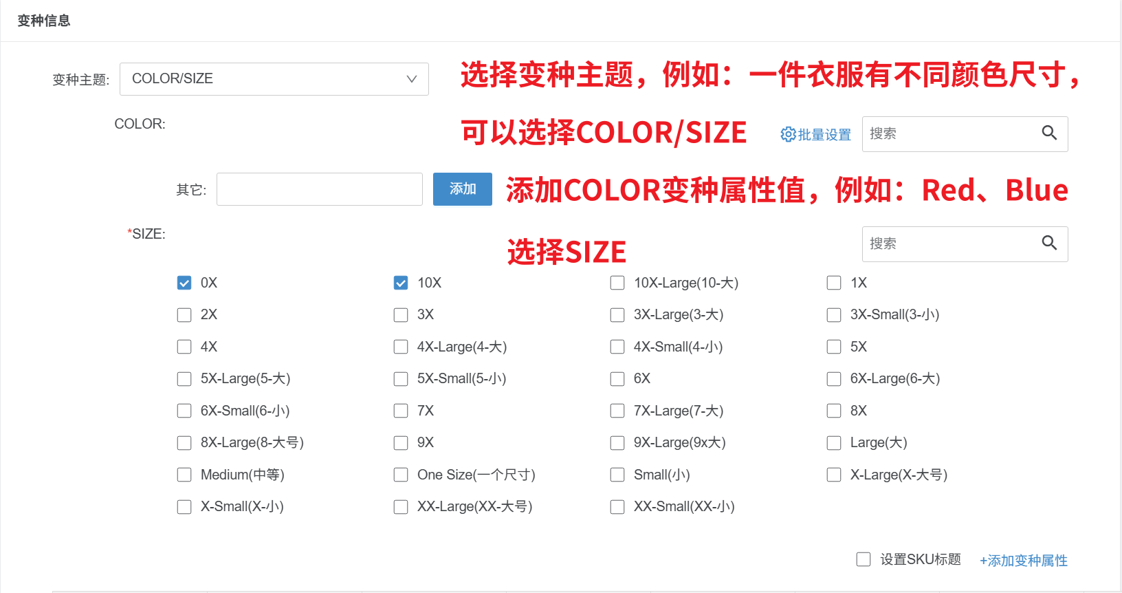 例如:color/size变种主题,那么变种输入color、size,color 下面输入具体的颜色单词不要输入其他词语或数字