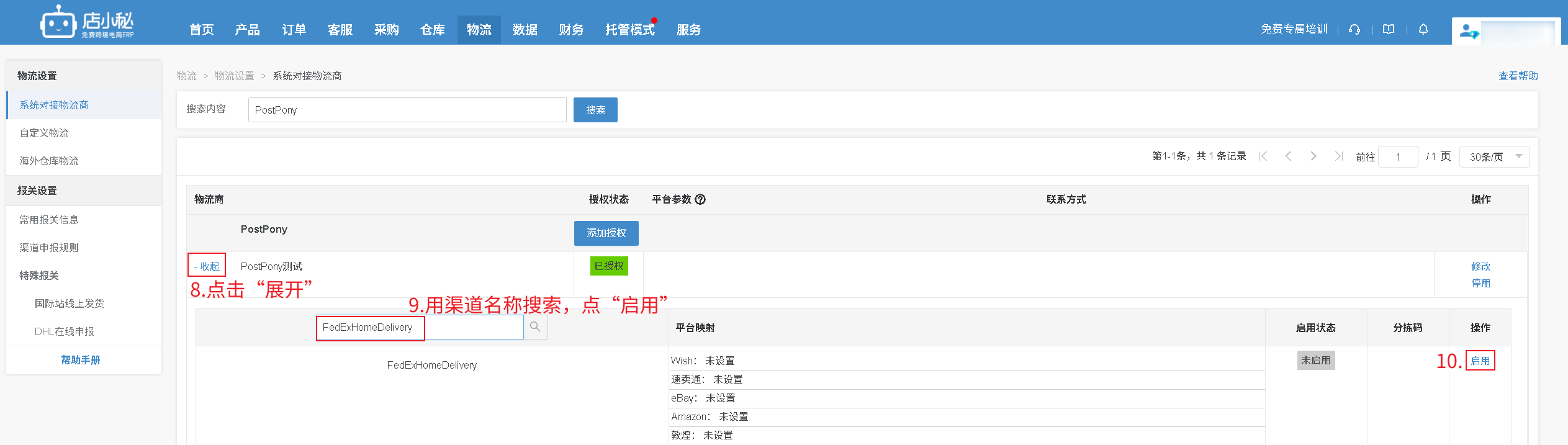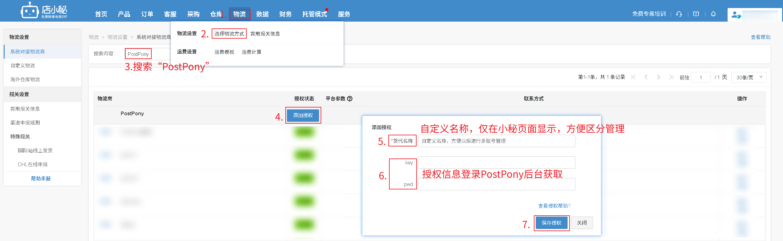第一步:【物流—选择物流方式—搜索“PostPony”—添加授权—自定义物流商名称—授权信息登录PostPony后台获取—保存授权】