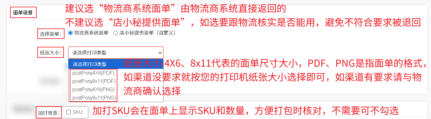 选择面单:请选“物流商系统面单”,由物流商系统直接返回的,不建议选“店小秘提供面单”,如选要跟物流核实是否能用,避免