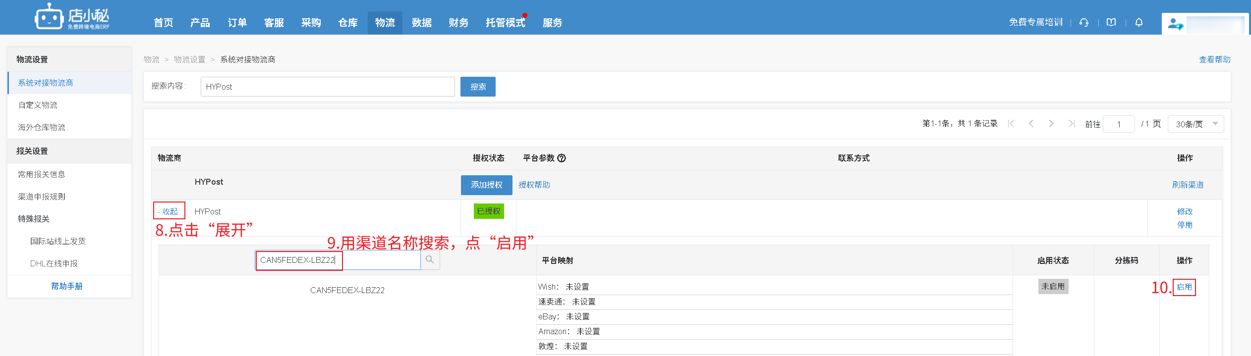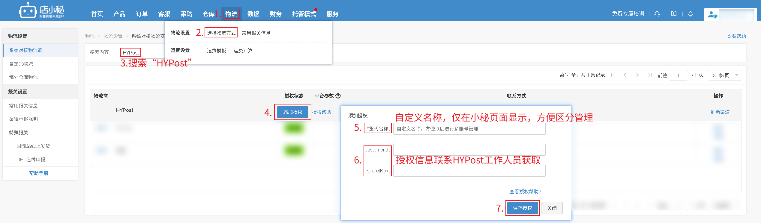 第一步:【物流—选择物流方式—搜索“HYPost”—添加授权—自定义物流商名称—授权信息联系HYPost工作人员获取—保存授权】