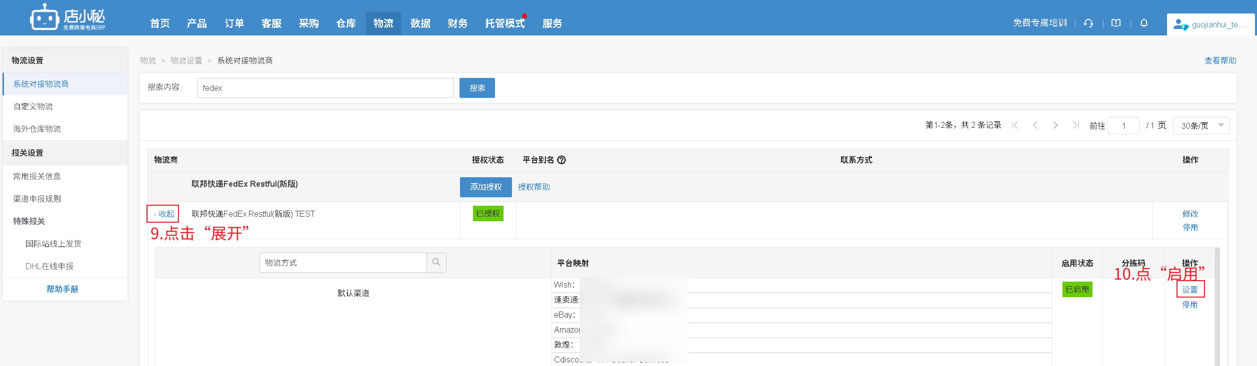 第一步完成授权后,仅代表店小秘和物流的授权打通了,接下来要启用渠道,目前联邦快递只有一个“默认渠道”,点启用,处理订单