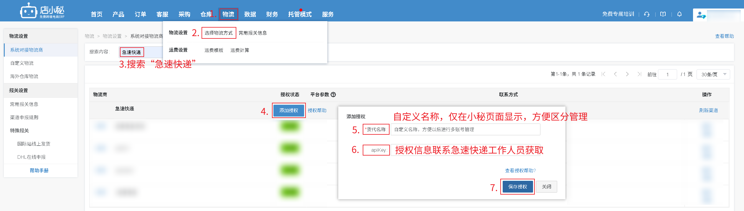 第一步:【物流—选择物流方式—搜索“急速快递’”—添加授权—自定义物流商名称—授权信息联系急速快递工作人员获取—保存授权】