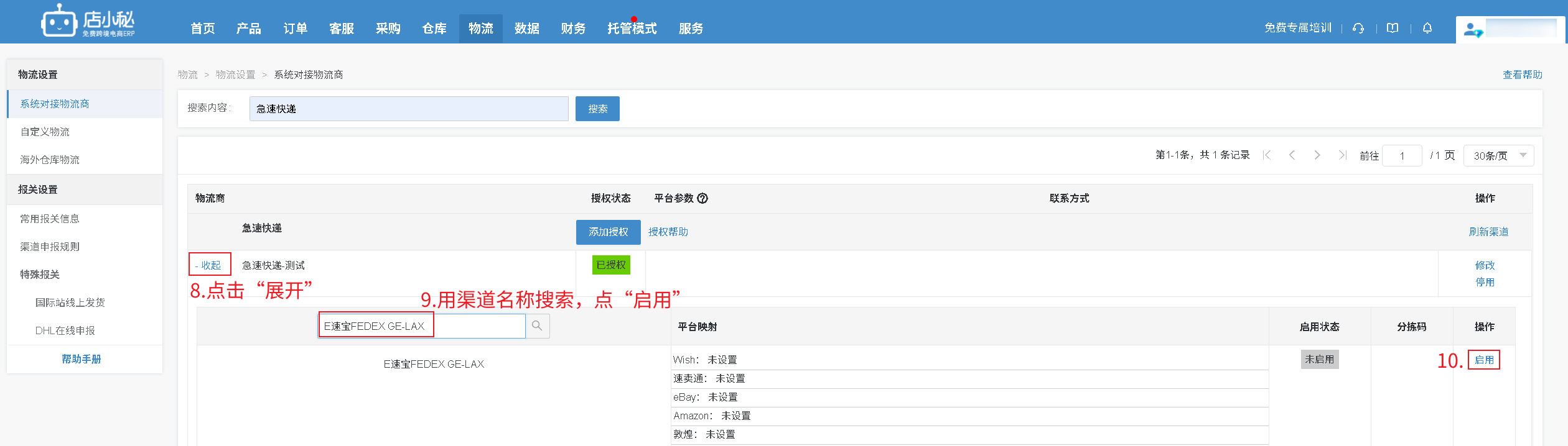 确认清楚后,在店小秘搜索这个渠道的名称,点启用,处理订单就可以选择“已启用”的渠道申请运单号。