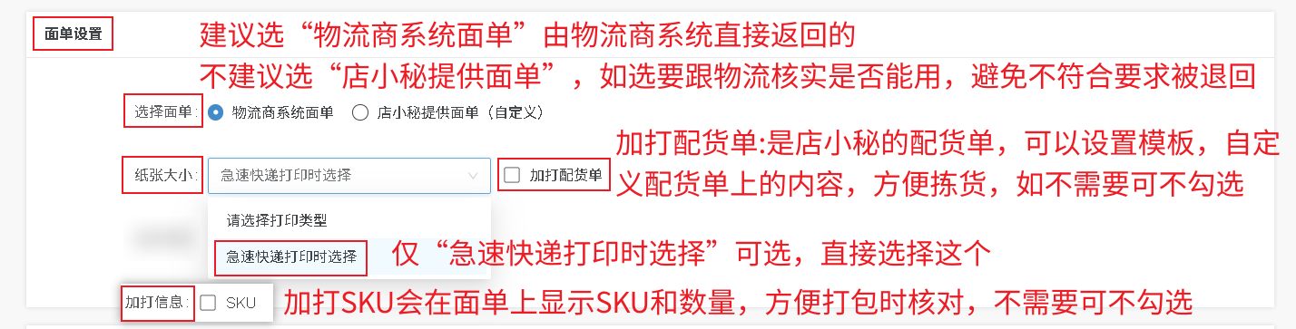 选择面单:请选“物流商系统面单”,由物流商系统直接返回的,不建议选“店小秘提供面单”,如选要跟物流核实是否能用,避免