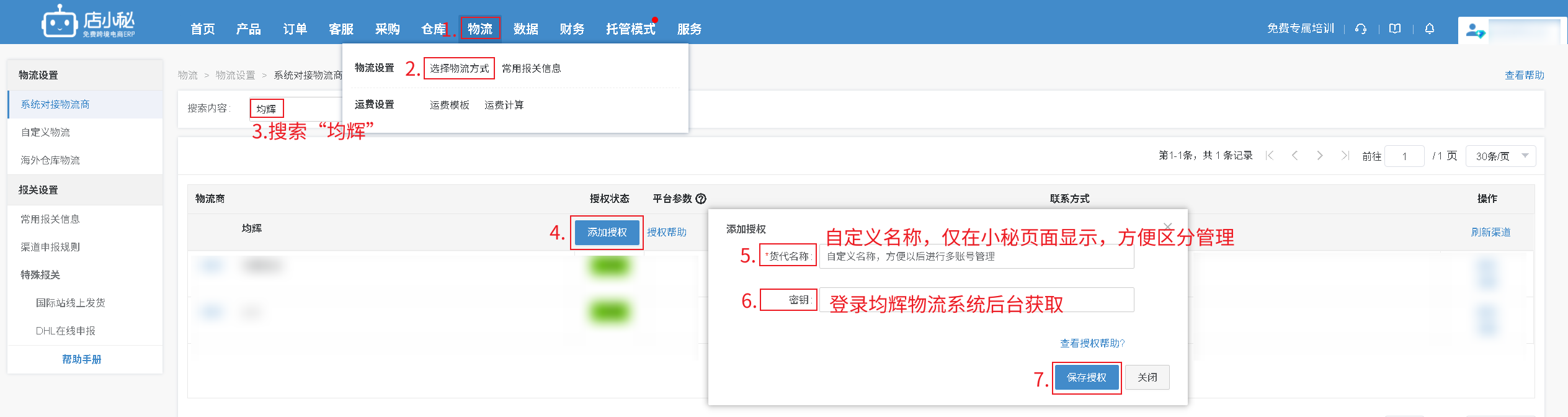 第一步:【物流—选择物流方式—搜索“均辉”—添加授权—自定义物流商名称—密钥:登录均辉物流系统后台获取—保存授权】