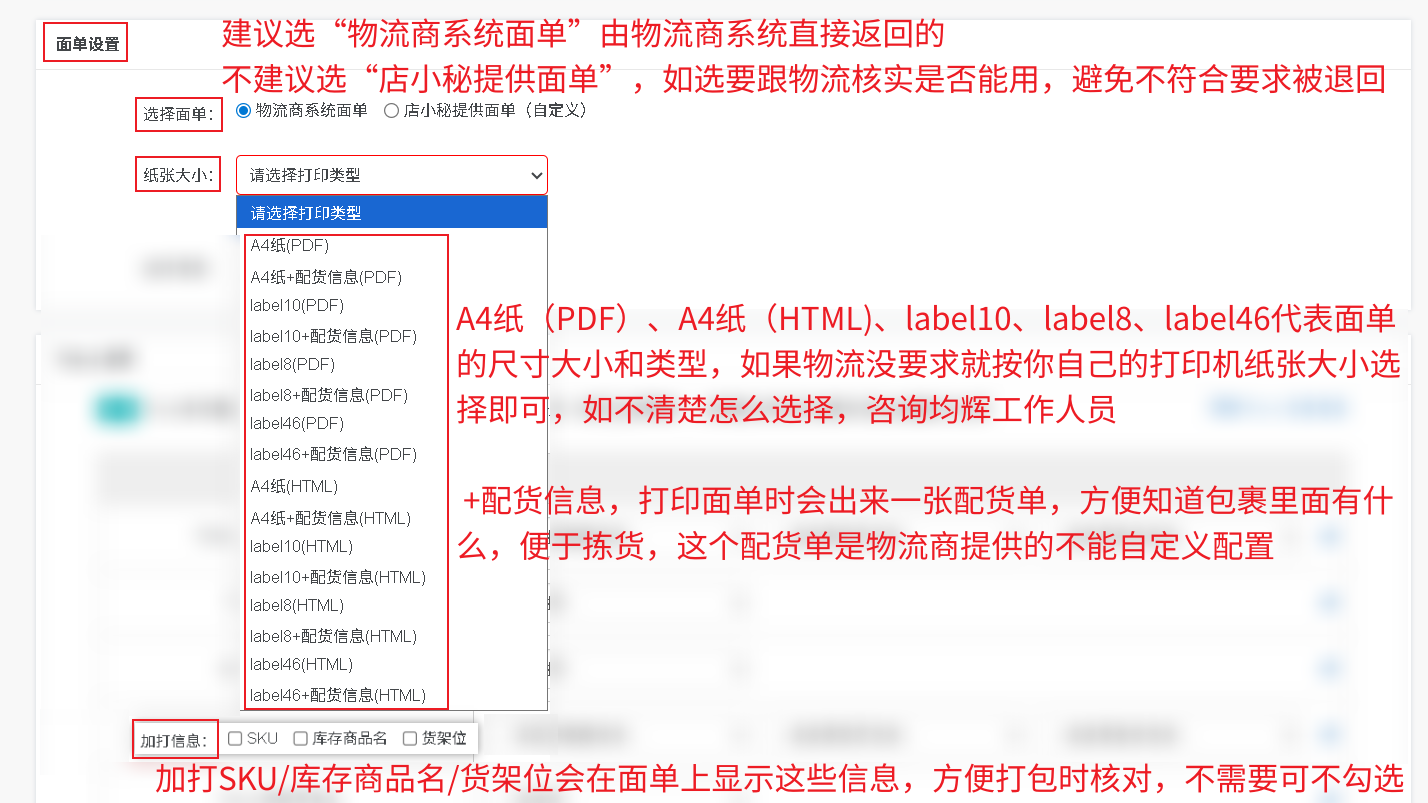 4纸(PDF)、A4纸(HTML)、label10、label8、label46代表面单的尺寸大小和类型,如果物流没要求就按你自己的打印机纸张大小选择即可,如不清楚怎么选择,咨询均辉工作人员