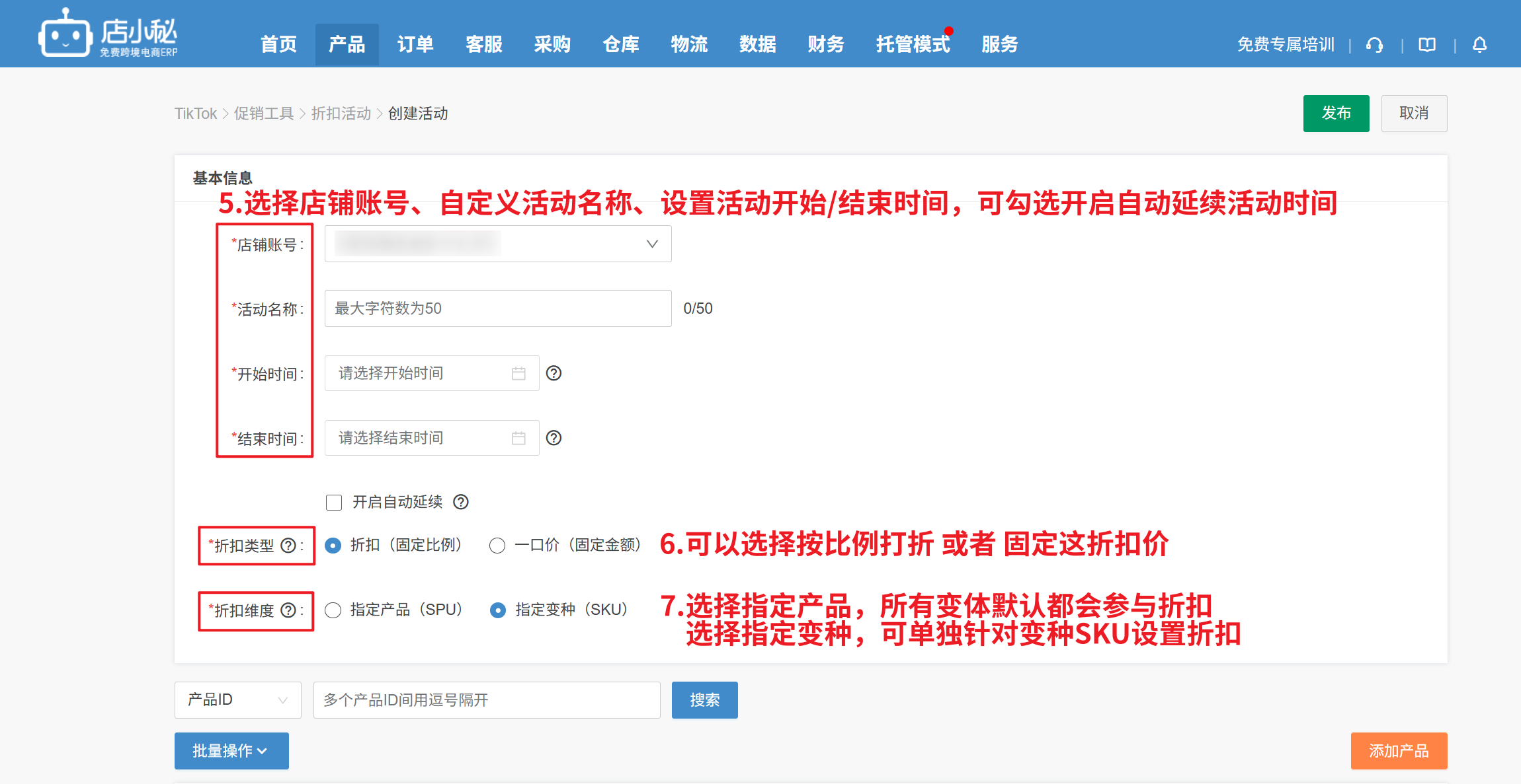 第二步:【选择店铺账号—自定义活动名称—选择开始/结束时间—选择折扣比例/一口价—选择指定产品/变种】