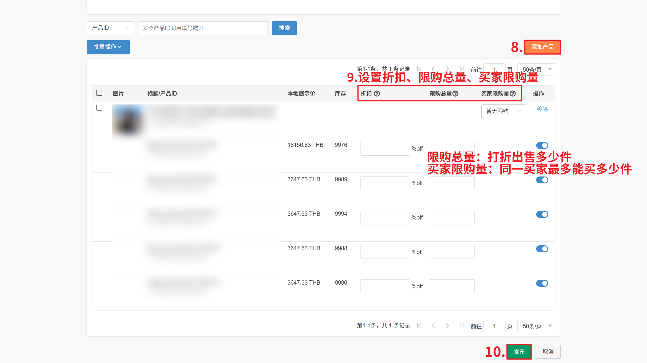 第三步:【添加产品—设置折扣价、限购、买家限购量—发布】