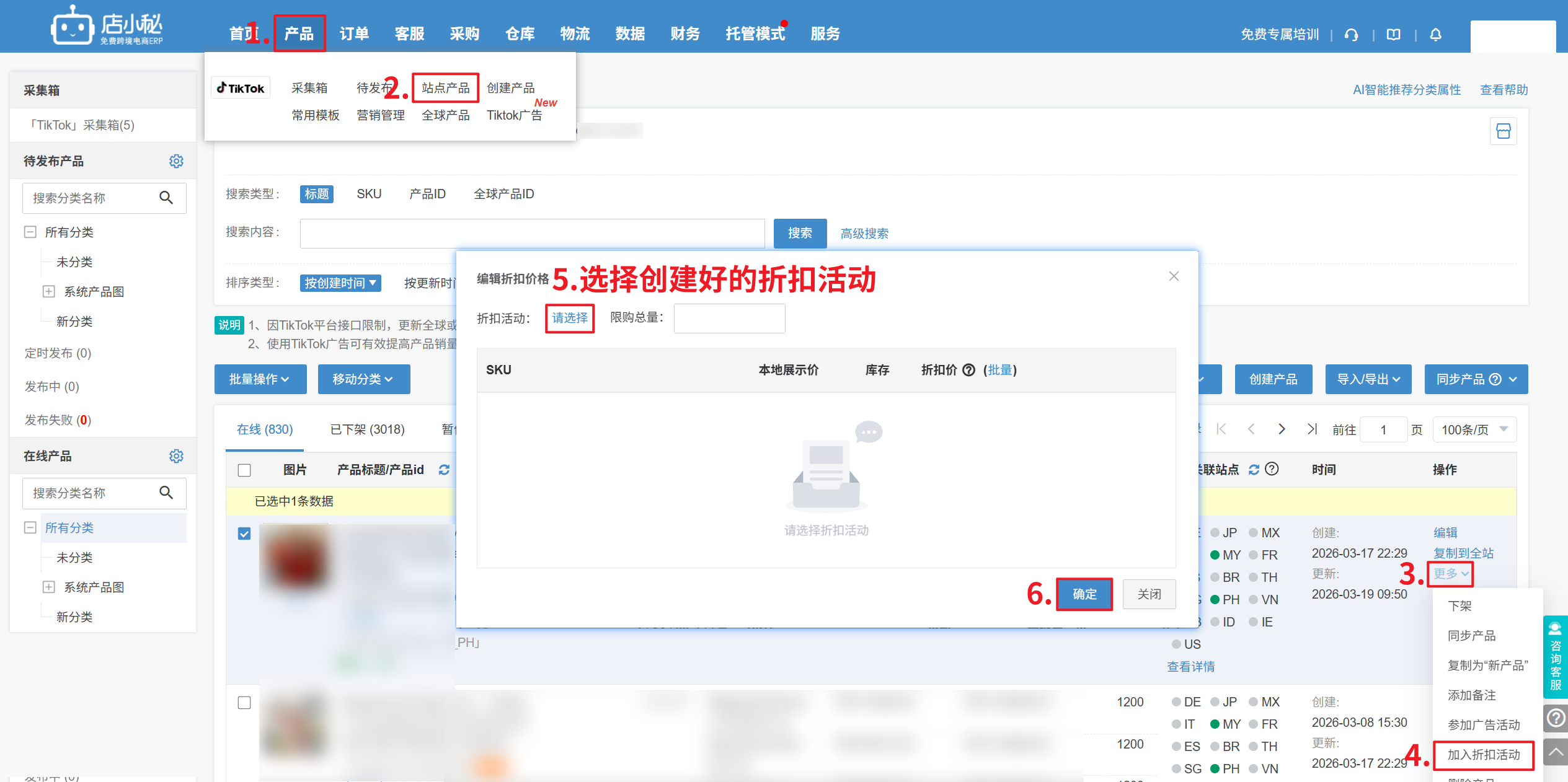 【产品—TikTok站点产品—点击更多—加入折扣活动—选择活动—确定】
