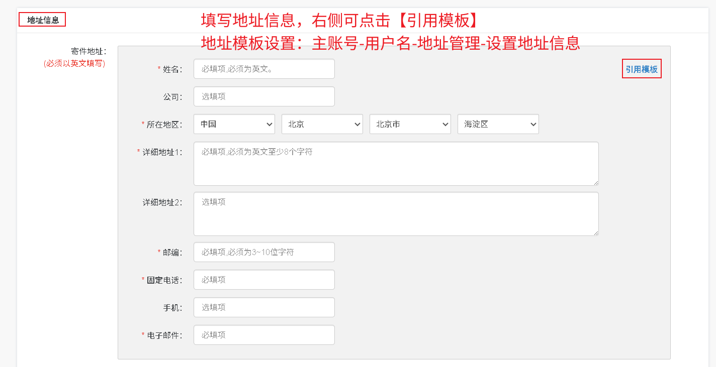 右侧可点击“引用模板”(地址模板设置:主账号-用户名-地址管理-设置地址信息)。